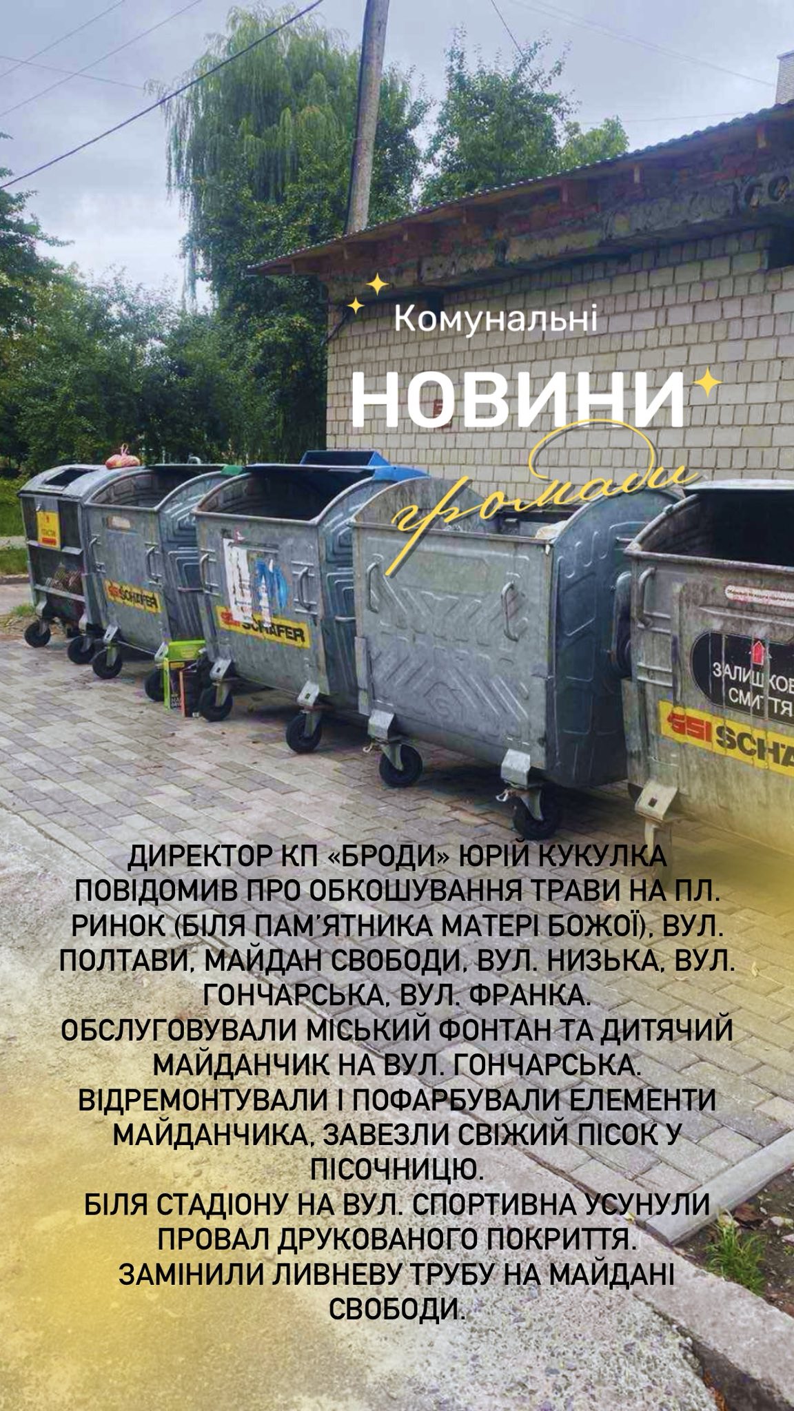 🔵 Директор КП «Броди» Юрій Кукулка повідомив про обкошування трави на пл. Ринок (біля памʼятника Матері Божої), вул. Полтави, Майдан Свободи, вул. Низька, вул. Гончарська, вул. Франка.