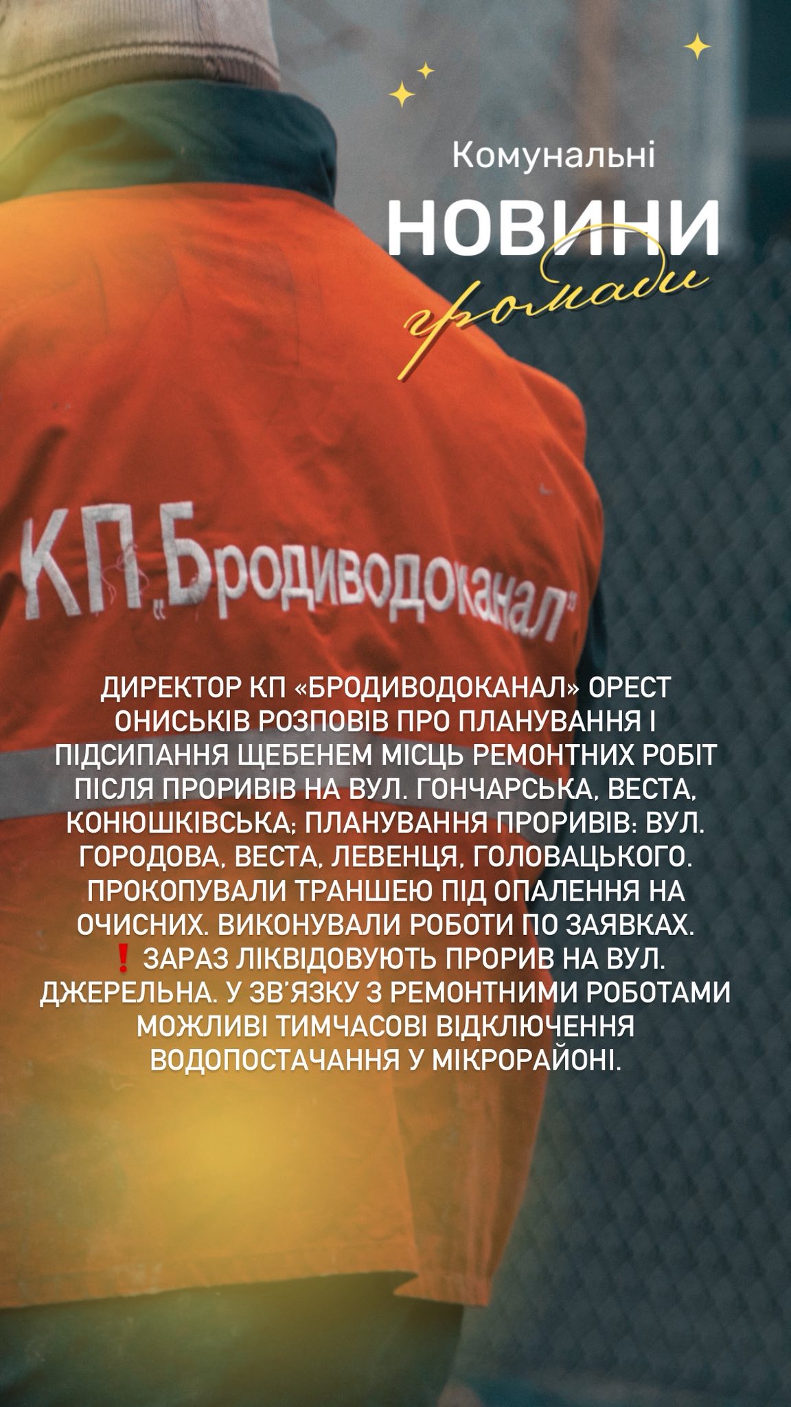 🔵Директор КП «Бродиводоканал» Орест Ониськів розповів про планування і підсипання щебенем місць ремонтних робіт після проривів на вул. Гончарська, Веста, Конюшківська; планування проривів: вул. Городова, Веста, Левенця, Головацького. Прокопували траншею під опалення на очисних. Виконували роботи по заявках.