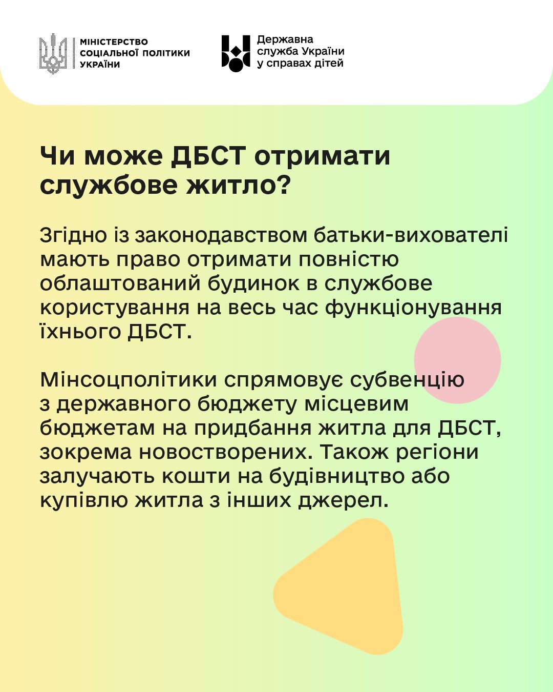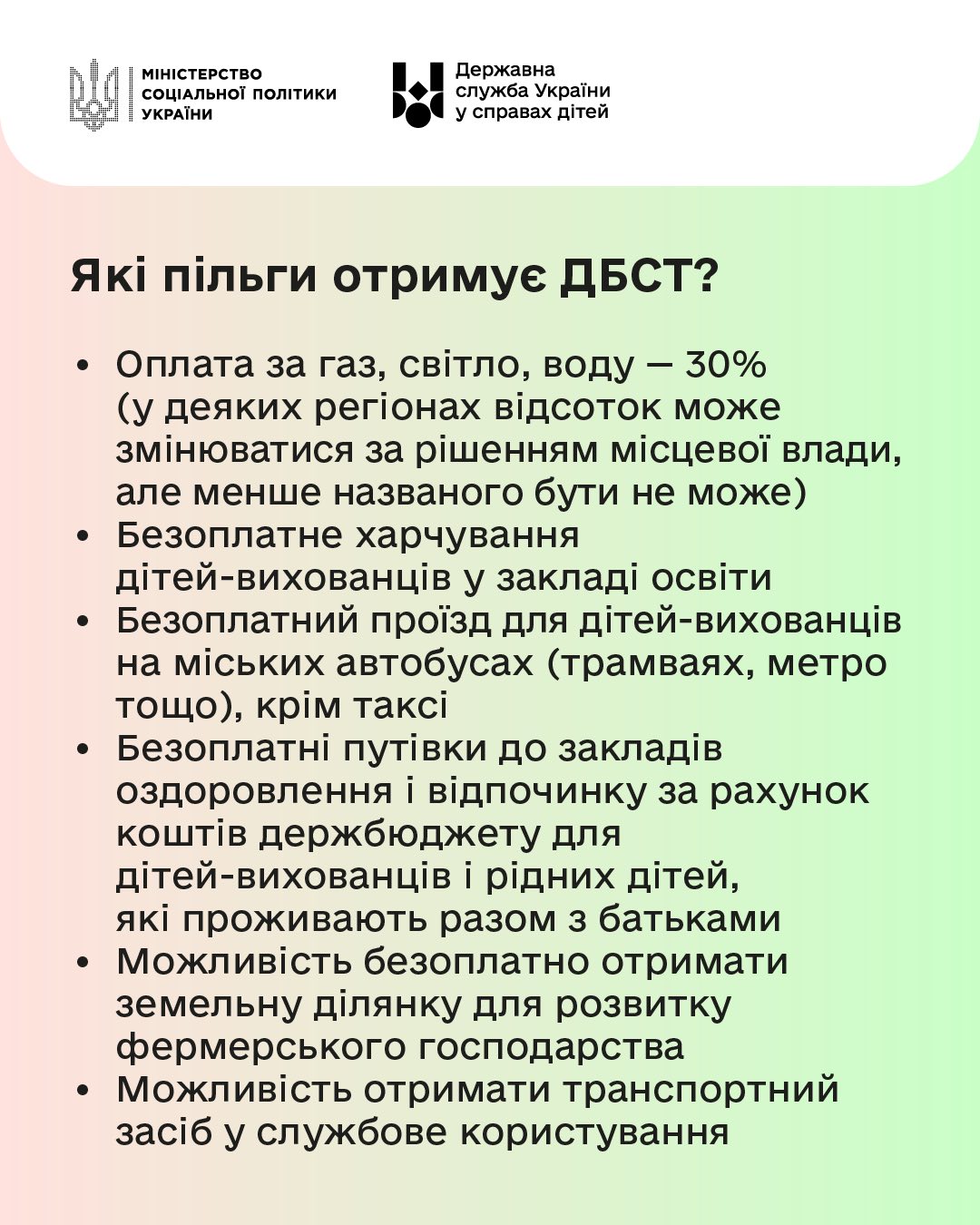 Держава активно підтримує розвиток сімейних форм виховання, зокрема ДБСТ. На картках нижче ви знайдете детальну інформацію про умови створення ДБСТ, вимоги до батьків-вихователів та розмір державної допомоги. Не залишайтеся байдужими до долі дітей, які потребують вашої любові та турботи! Дитячий будинок сімейного типу може стати справжнім домом для дитини, яка його потребує. Розгляньте можливість створення ДБСТ та подаруйте щасливе дитинство тим, хто цього найбільше потребує. Державна підтримка та соціальний супровід допоможуть вам у цій важливій справі.