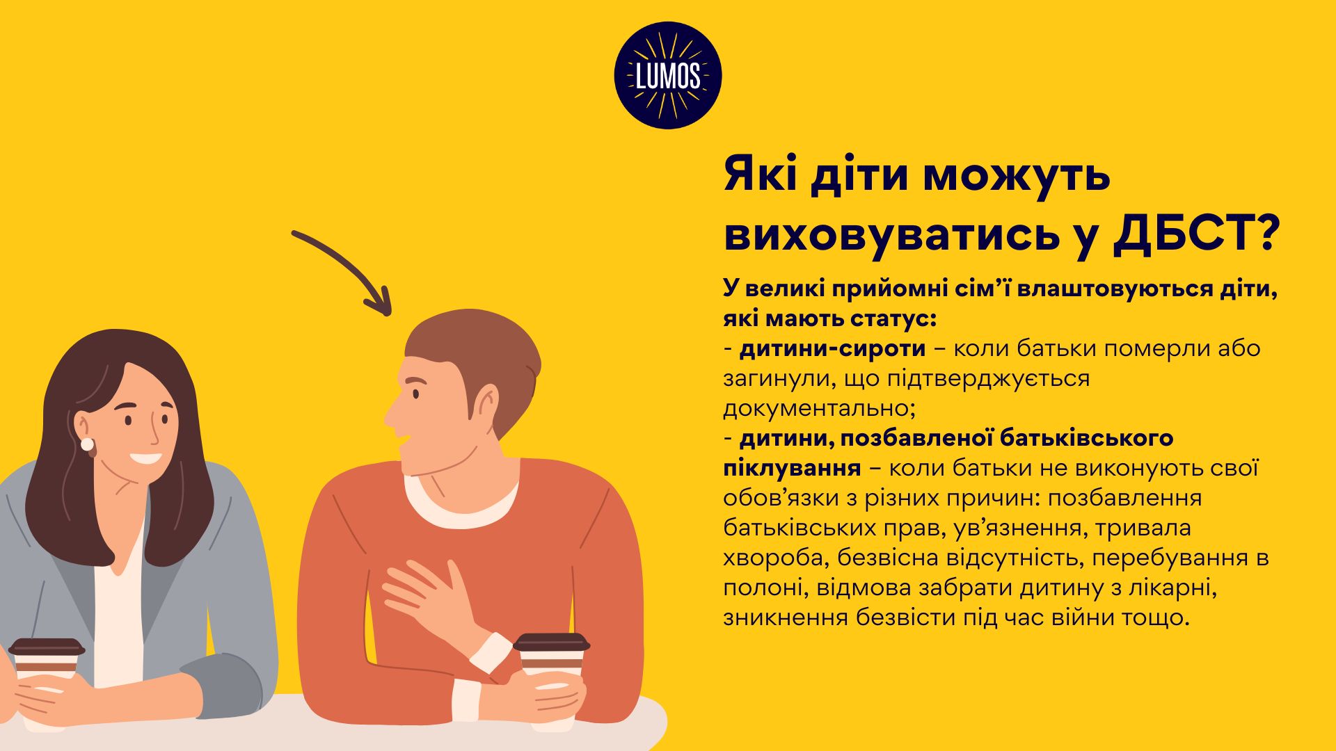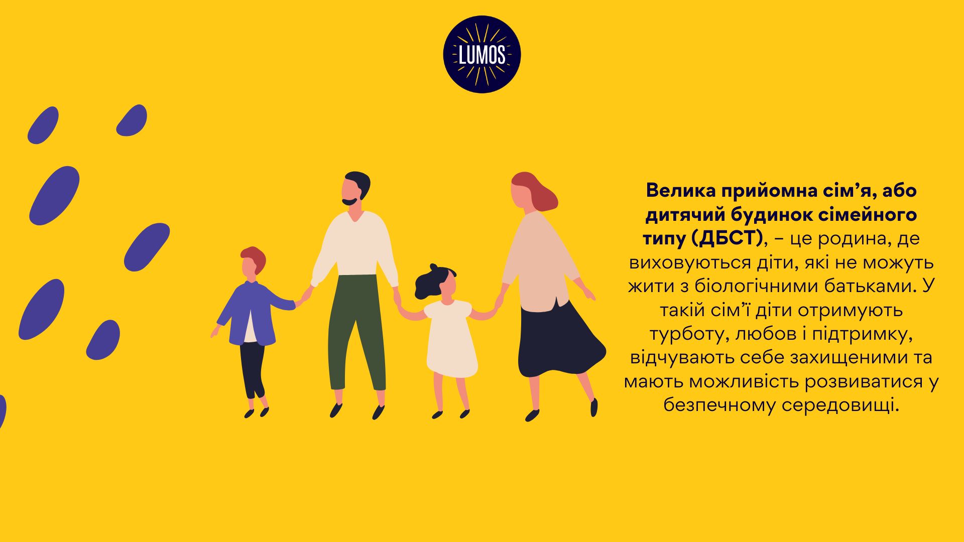 Велика прийомна сім’я, або дитячий будинок сімейного типу (ДБСТ), – це справжній дім для дітей, які тимчасово чи постійно не можуть жити з біологічними батьками. У такій сім’ї дитина отримує турботу, любов та всебічну підтримку, відчуває себе захищеною та має можливість повноцінно розвиватися у безпечному середовищі. ДБСТ є важливою альтернативою інтернатним закладам, надаючи дітям шанс на щасливе дитинство.