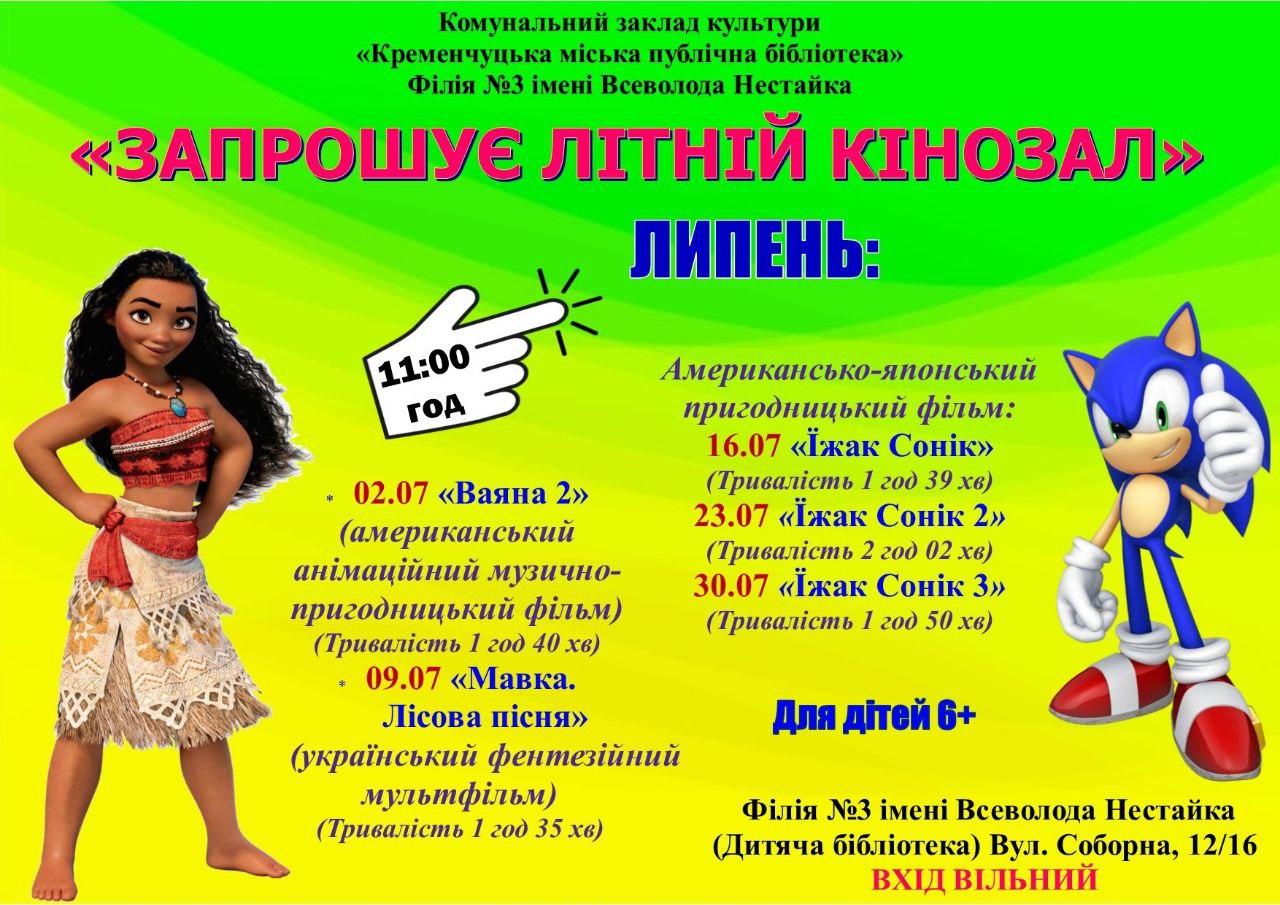 Літо – це ідеальний час для нових вражень та відпочинку, особливо для найменших мешканців міста. У Кременчуці, міська публічна бібліотека імені Всеволода Нестайка, а саме її філія №3, підготувала чудовий подарунок для дітей та їхніх батьків – серію безкоштовних кінопоказів. Це ідеальна можливість для всіх охочих відвідати Дитячий кінозал у Кременчуці та провести час цікаво й пізнавально, занурившись у світ пригод та фантазії.Протягом усього липня, кожної середи об 11:00, двері філії №3 бібліотеки гостинно відкриті для юних кіноглядачів. Тут на них чекають захоплюючі кінопокази для дітей, які подарують багато радості та незабутніх емоцій. Організатори відповідально підійшли до формування репертуару, включивши до нього як сучасні українські, так і популярні зарубіжні мультфільми Кременчука. Такий підхід забезпечує різноманіття та привабливість програми для широкої дитячої аудиторії.Перший літній кіносеанс відбудеться вже 2 липня, запрошуючи всіх на довгоочікувану анімаційну пригоду «Ваяна-2». Ця стрічка обіцяє вражаючу графіку та захоплюючий сюжет, що неодмінно припаде до душі маленьким мрійникам. 9 липня глядачі матимуть унікальну нагоду знову насолодитися справжнім шедевром вітчизняної анімації – «Мавка. Лісова пісня». Цей мультфільм не лише розважає, але й знайомить дітей з багатством української культури, фольклору та природи, виховуючи любов до рідного краю. Такі сімейні перегляди сприяють культурному розвитку та вихованню підростаючого покоління.Наступні три середи липня – 16, 23 та 30 липня – будуть присвячені швидкісному та веселому світові «Їжака Соніка». Усі три частини цього динамічного фільму будуть показані послідовно, дозволяючи дітям повністю зануритися у пригоди улюбленого синього героя. Це чудові літні розваги, які дозволять весело провести час у місті Кременчук.Важливо зазначити, що до перегляду запрошуються діти віком від 6 років. Присутність батьків або інших дорослих є бажаною, адже спільний перегляд улюблених історій зміцнює сімейні зв’язки та створює приємні спогади. Вхід до Дитячого кінозалу у Кременчуці є абсолютно вільним, що робить цю культурну ініціативу доступною для всіх мешканців та гостей міста, хто шукає якісні безкоштовні фільми та освітні заходи.Філія №3 бібліотеки імені Всеволода Нестайка розташована за зручною адресою: вул. Соборна, 12/16. Це центральне розташування дозволяє легко дістатися до місця проведення кінопоказів з будь-якого куточка міста. Для організованих груп, наприклад, з дитячих садків, шкіл або літніх таборів, необхідний попередній запис. Це допоможе забезпечити комфортні умови для всіх відвідувачів та уникнути незручностей. Записатися можна за телефоном: 098-791-02-13.Цей проект демонструє, як сучасна бібліотека Кременчук стає не лише сховищем знань, а й динамічним центром культурного дозвілля та розвитку громади. Завдяки таким ініціативам, як цей дитячий кінозал, діти отримують можливість провести літній час не лише весело, а й з користю, розширюючи свій кругозір та розвиваючи уяву. Не пропустіть чудову нагоду подарувати своїм дітям незабутні емоції та приємні спогади про літо в Кременчуці! Це одні з найкращих літні розваги у Кременчуці. Запрошуємо всіх бажаючих!
