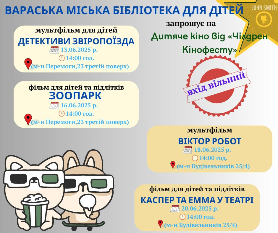 З 13 по 20 червня у Вараській міській бібліотеці триває дитячий кінофестиваль “Чілдрен Кінофест 2025”. Це чудова можливість для дітей та їхніх батьків насолодитися переглядом сучасних європейських фільмів та мультфільмів, спеціально підібраних для юної аудиторії. Дитячий кінофестиваль пропонує якісний та змістовний контент, який сприяє розвитку та позитивному дозвіллю.