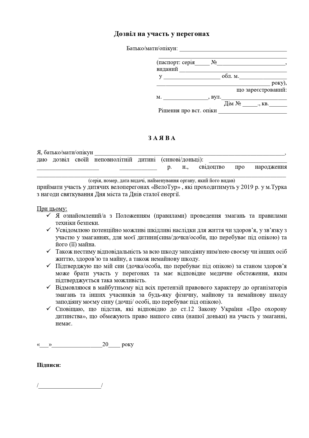 - Надати згоду від батьків (опікунів) на участь дитини у змаганнях