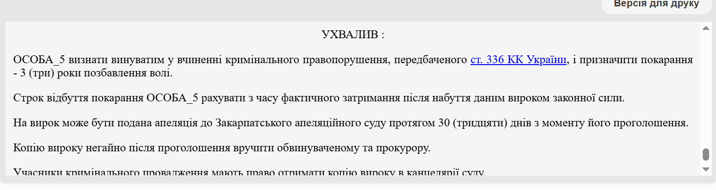 Закарпатця визнали винним за статтею 336 ККУ та засудили до 3 років позбавлення волі за ухилення від мобілізації.