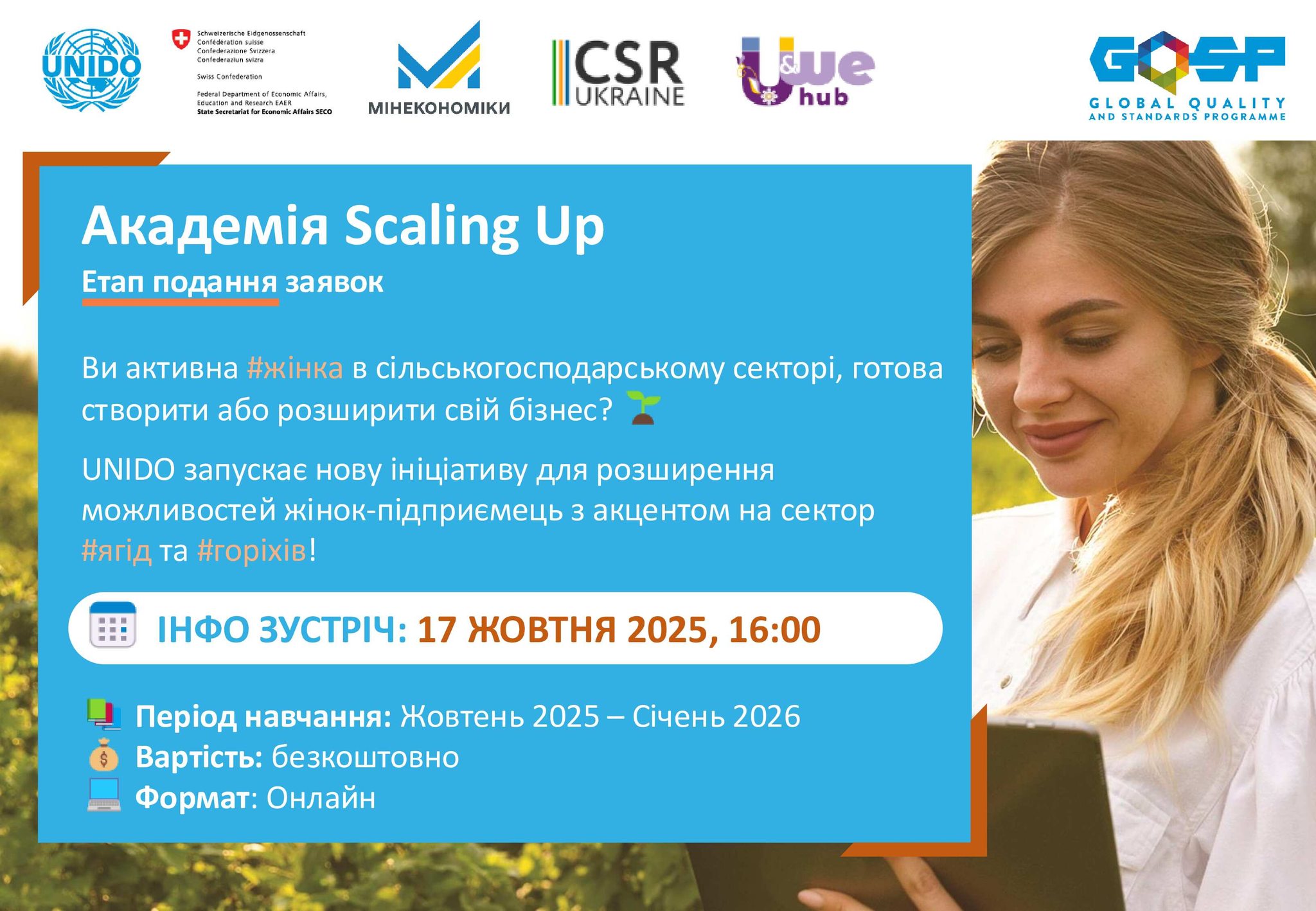📝👭🌱🍒🍓 Для жінок, які працюють у секторі ягід і горіхів, а також у ширшому агросекторі, або прагнуть розпочати власну діяльність у цій сфері, у рамках Global Quality and Standards Programme (GQSP) Ukraine, що імплементується Організацією Об’єднаних Націй з промислового розвитку (UNIDO) та фінансується Державним секретаріатом Швейцарії з економічних питань (SECO), U&WE HUB (Центр «Розвиток КСВ») запускає нову навчальну програму. Scaling Up Academy поєднує навчання, практичні інструменти та індивідуальну підтримку, спрямовані на розширення можливостей жінок у підприємництві, підвищення їхньої конкурентоспроможності та підтримку сталого розвитку аграрного сектору України. Ця програма відкриває нові горизонти для представниць прекрасної статі, які прагнуть успіху в агробізнесі.
