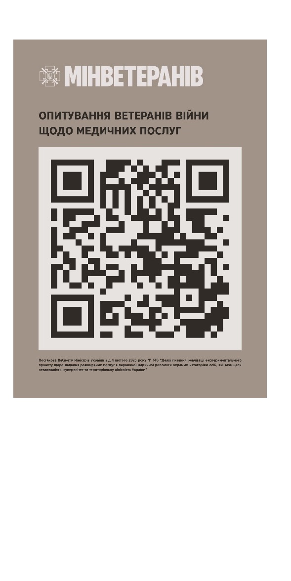 Міністерство у справах ветеранів України розпочинає важливе опитування для оцінки ефективності експериментального проєкту, спрямованого на надання розширених послуг з первинної медичної допомоги. Цей проєкт охоплює окремі категорії осіб, які мужньо захищали незалежність, суверенітет та територіальну цілісність України. Ініціатива реалізується відповідно до постанови Кабінету Міністрів України від 04 лютого 2025 року №140. Ваша участь у цьому опитуванні є надзвичайно цінною. Дані, які будуть зібрані, відіграють ключову роль у подальшому вдосконаленні медичної системи для ветеранів. Ми прагнемо забезпечити якомога кращу медичну допомогу нашим захисникам, і ваше відгук допоможе нам у досягненні цієї мелі. Опитування дозволить виявити сильні сторони проєкту та визначити напрямки для його покращення. Кожен голос має значення для формування ефективної системи підтримки тих, хто поклав своє життя та здоров’я на вівтар захисту Батьківщини. Ми щиро запрошуємо всіх, хто має відношення до зазначених категорій, долучитися до цього важливого процесу. Ваша думка допоможе нам зробити медичні послуги більш доступними та якісними. Очікуємо на вашу активну участь у формуванні майбутнього медичного забезпечення для ветеранів.