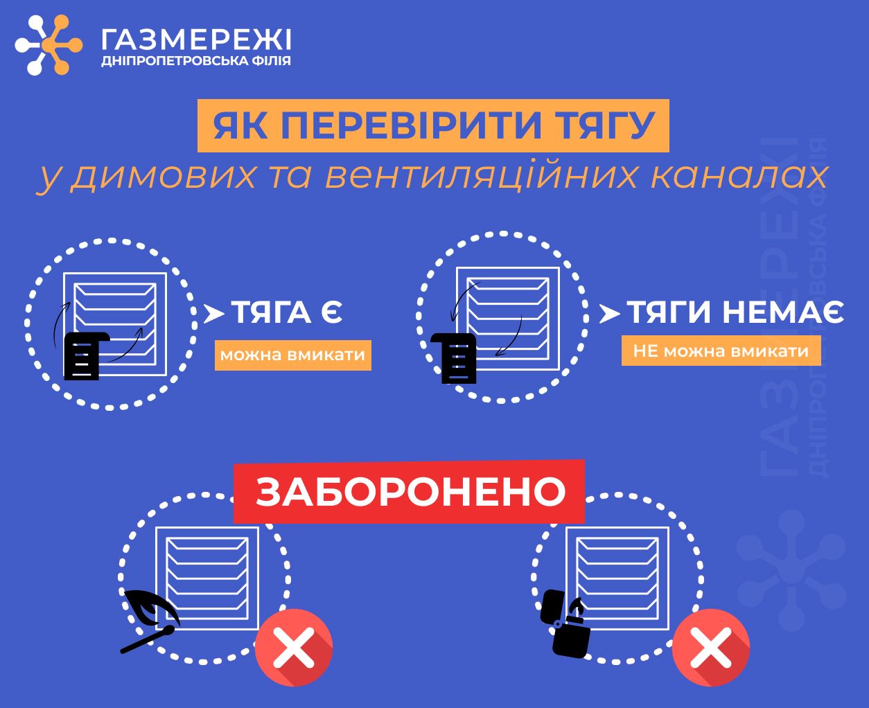 Дніпропетровська філія «Газмережі» нагадує споживачам, простий і безпечний спосіб перевірки: необхідно піднести аркуш паперу до вентиляційної решітки. Якщо він тримається — все гаразд, тяга є. Якщо ні — тяга відсутня.