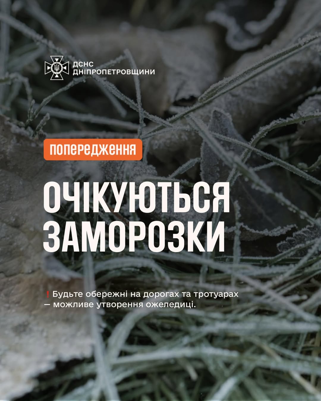 Дніпропетровський регіональний центр з гідрометеорології офіційно оголосив про метеорологічне попередження, що стосується всієї території області. Особливу увагу варто приділити прогнозу на ніч та ранок 26 вересня, коли очікуються заморозки на поверхні ґрунту. Температурний показник може сягнути від 0°C до 4°C по області.