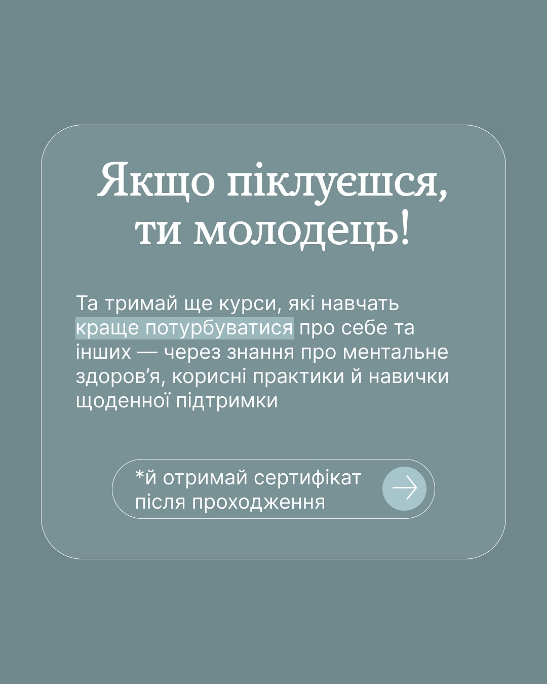 У каруселі представлені наші основні напрямки навчання. Рекомендуємо ознайомитися з ними детальніше та зареєструватися за посиланням нижче. Усі слухачі, які успішно пройдуть курси, отримають сертифікати, що підтверджують здобуті знання та навички. Це чудовий інструмент для особистісного зростання та професійного розвитку.