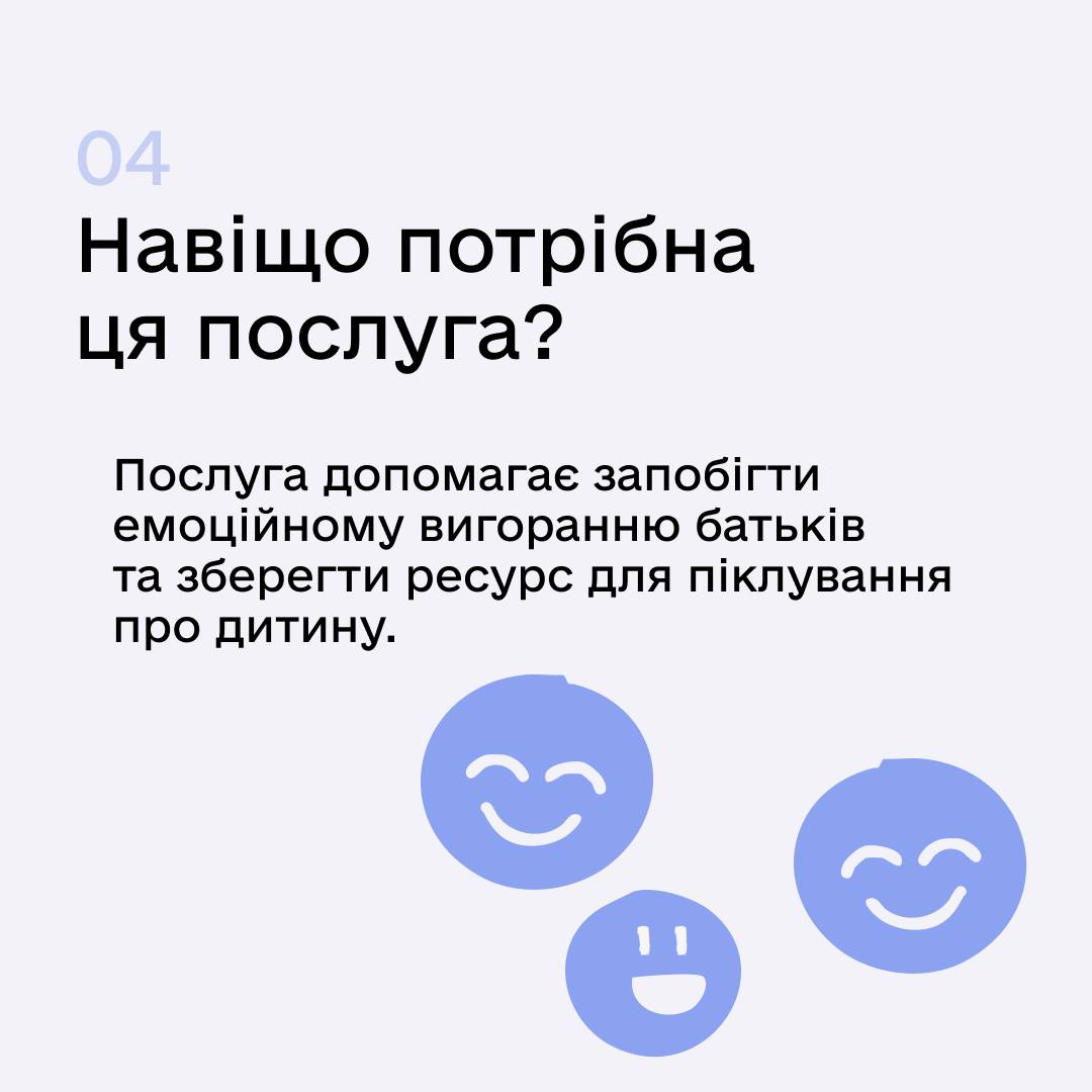 Упродовж дня дитина отримує нагляд та допомогу із харчуванням і гігієною. Крім того, психологи та педагоги проводять розвиткові заняття й допомагають опанувати навички самообслуговування, спілкування та готують її до навчального процесу. Дитина знайомиться з однолітками та може знайти друзів. Поки дитина під наглядом досвідчених фахівців, батьки мають час працювати, зайнятися власними справами чи перепочити. Усе це допомагає запобігти емоційному вигоранню та зберегти ресурс для піклування про дитину.