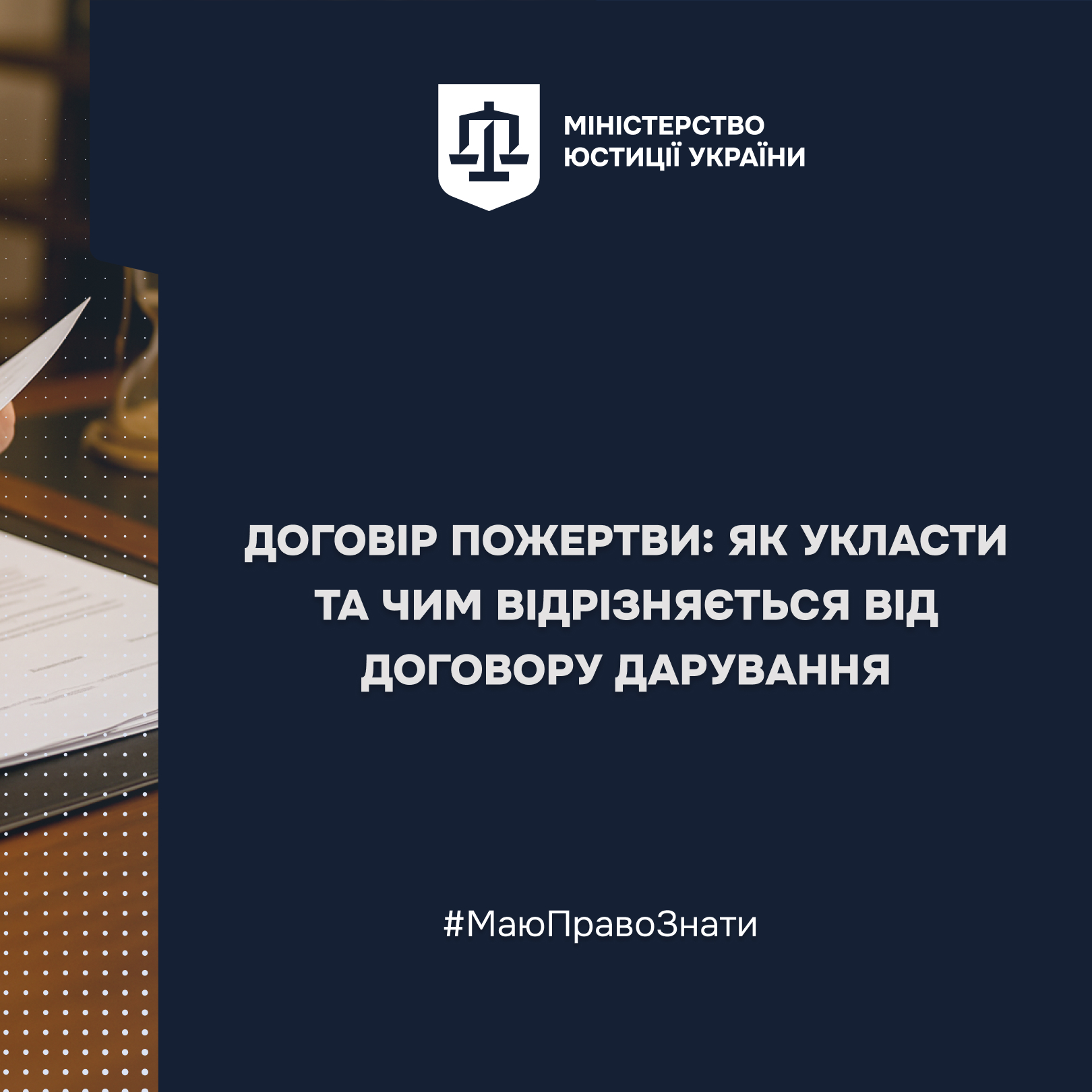 Договір пожертви – це важливий правовий інструмент, що забезпечує юридичну чіткість у сфері благодійності та допомоги. Навіть найщиріші наміри щодо передачі майна чи коштів потребують належного правового оформлення, щоб уникнути непорозумінь та забезпечити дотримання волі дарувальника. Розуміння відмінностей між договором пожертви та договором дарування є ключовим для правильного вибору правової форми.Згідно з чинним цивільним законодавством України, пожертвою є особливий вид дарування. Вона передбачає передачу дарувальником (пожертвувачем) рухомих або нерухомих речей, зокрема грошових коштів, цінних паперів чи іншого майна, набувачу (обдаровуваному) для досягнення певної, наперед чітко обумовленої мети. Ця цільова спрямованість є фундаментальною відмінністю договору пожертви від звичайного договору дарування, де мета використання майна, як правило, не визначається або є абстрактною.Сторонами у такому правочині можуть виступати різноманітні суб’єкти права, що підкреслює універсальність цього інструменту. Це можуть бути як фізичні особи, що бажають надати допомогу, так і юридичні особи – благодійні фонди, громадські організації, підприємства. Крім того, держава Україна, Автономна Республіка Крим та територіальні громади також можуть бути сторонами договору пожертви, виступаючи як пожертвувачами, так і набувачами майна для суспільних потреб.Однією з найважливіших особливостей договору пожертви є право пожертвувача контролювати цільове використання переданого майна. Якщо ці активи використовуються не за призначенням, визначеним у договорі, пожертвувач має законне право вимагати розірвання угоди. Це надає дарувальнику гарантії того, що його кошти або майно будуть використані саме для тієї мети, задля якої вони були надані. Наприклад, якщо фінансові ресурси були пожертвувані на будівництво лікарні, а їх використовують на інші цілі, пожертвувач може вимагати повернення наданого.Форма договору пожертви залежить від його предмету. Для нерухомого майна, а також у випадках, передбачених законом, договір пожертви має бути укладений у письмовій формі та може потребувати нотаріального посвідчення. Щодо рухомого майна, вартість якого перевищує певну встановлену законом суму, також може вимагатися письмова форма. У всіх інших випадках, коли вартість незначна, допускається усна форма. Правочин вважається укладеним з моменту прийняття дару обдаровуваним, що підтверджує його згоду з умовами договору, включаючи цільове призначення.Важливо пам’ятати про правові обмеження щодо укладення такого договору. Зокрема, батьки (усиновлювачі), опікуни та піклувальники не мають права пожертвувати майно своїх дітей або підопічних осіб. Це правило спрямоване на захист майнових прав неповнолітніх та недієздатних осіб, забезпечуючи, щоб їхнє майно не було відчужене без належної вигоди для них. Розуміння цих нюансів є критично важливим для всіх сторін правочину. Усі ці аспекти підкреслюють, що договір пожертви – це не просто акт доброї волі, а складний юридичний документ, що вимагає обізнаності та відповідальності. Тому, перш ніж укладати подібну угоду, варто ретельно вивчити всі умови та, за необхідності, звернутися за консультацією до фахівців у галузі права. Це допоможе уникнути потенційних проблем та забезпечить викон