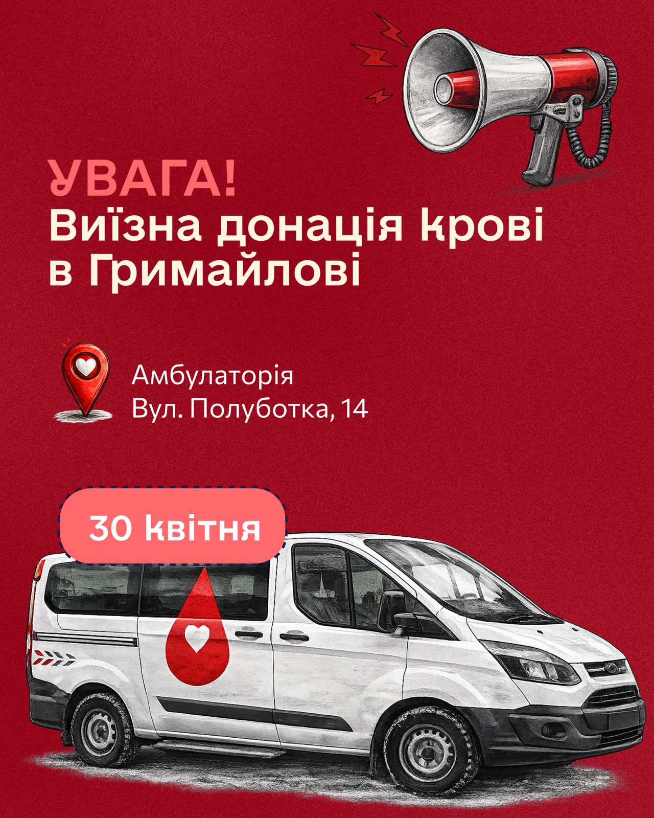 30 квітня 2026 року на території Гримайлівської амбулаторії відбудеться виїзний забір крові, який проведуть фахівці Тернопільського обласного центру служби крові Тернопільської обласної ради.