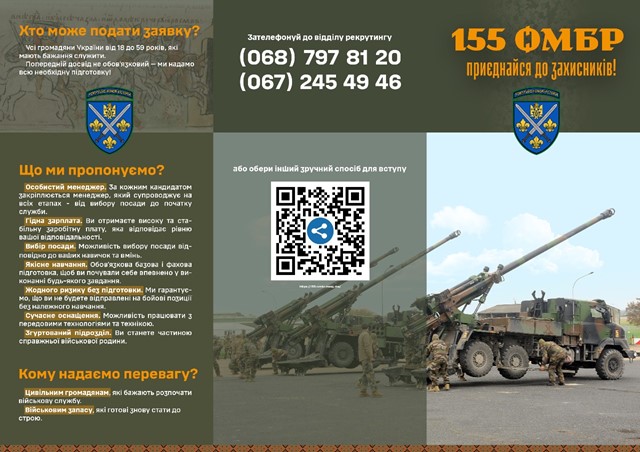 Станьте до лав ЗСУ! Ми чекаємо на вас у 155 окремій механізованій бригаді! Зробіть свій внесок у перемогу, обравши службу, яка вам до душі. Разом ми сильніші!