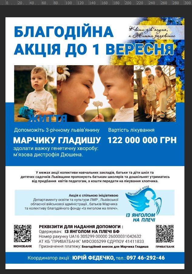 На Львівщині триває благодійна акція, спрямована на порятунок 3-річного Марка Гладиша, у якого діагностовано рідкісне генетичне захворювання — м’язова дистрофія Дюшена. Ця хвороба прогресує, поступово знищуючи м’язи та позбавляючи дитину можливості рухатися, а згодом і самостійно дихати.