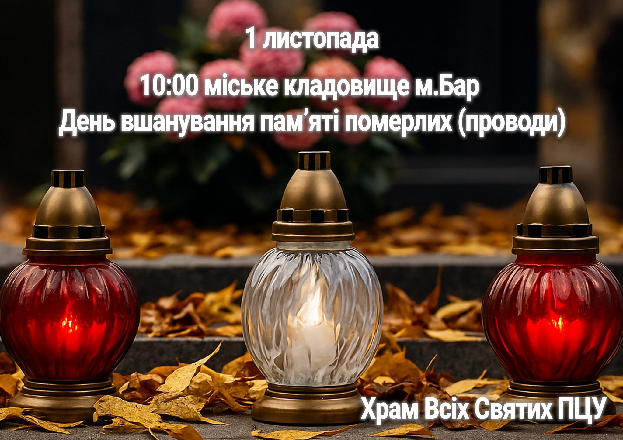 1 листопада, в День вшанування пам’яті померлих, о 10:00 на міському кладовищі міста Бар відбудуться традиційні Проводи. Ми щиро запрошуємо всіх небайдужих долучитися до спільної молитви за душі тих, хто відійшов у вічність. Це особливий день, коли ми згадуємо наших близьких, друзів та всіх, хто боровся за наше майбутнє.