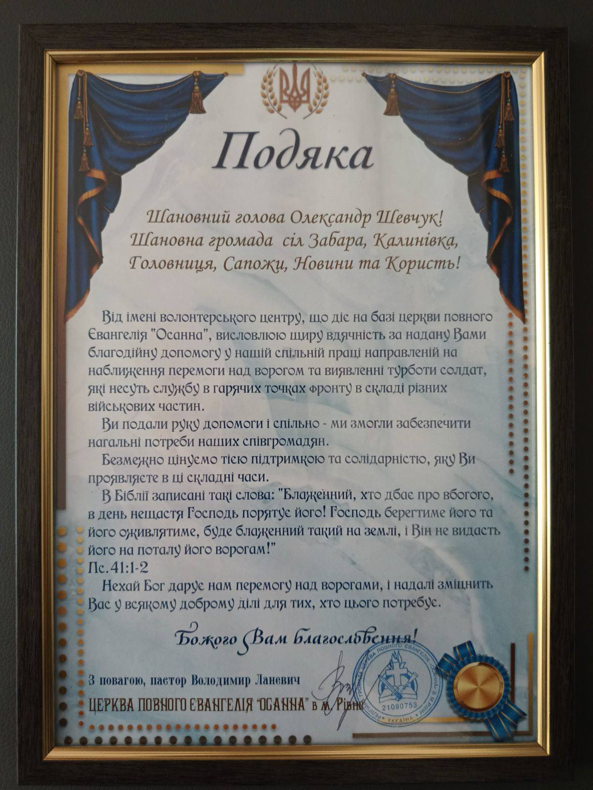 З гордістю ділимося з вами отриманими подяками від командування 68 окремої єгерської бригади ім.Олекси Довбуша та церкви “Осанна”, яка допомагає із харчування воїнів ЗСУ у різних госпіталях. Це подяка кожному з вас — за щиру молитву, жертовну допомогу, добре серце й підтримку наших захисників.