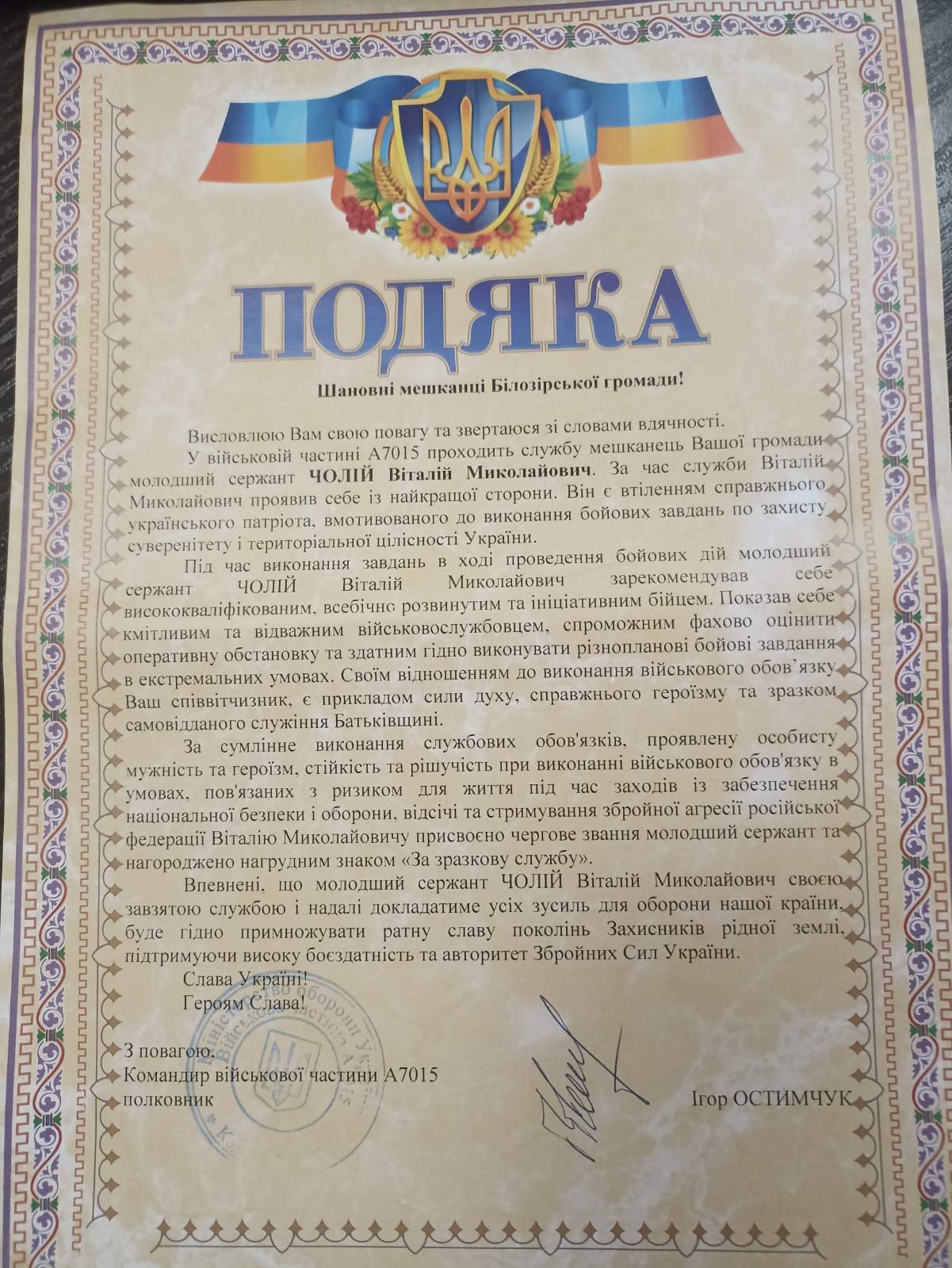 З глибокою повагою та щирою вдячністю звертаємося до вас, наших відважних українських воїнів-земляків, які щоденно стоять на захисті миру та майбутнього України. Кожна отримана подяка українським воїнам від командирів військових частин за вашу неперевершену службу є свідченням вашої мужності та професіоналізму. Це нагадування про те, що подяка українським воїнам – це не просто слова, а глибоке усвідомлення вашого безцінного внеску у збереження суверенітету та незалежності нашої держави. Ваша мужність, вірність присязі та самовідданість є прикладом для кожного з нас.Ваша щоденна служба, кожна година, проведена на передовій або у тилу, є незламним щитом, що оберігає наш спокій та дозволяє мільйонам українців жити, працювати і вірити у краще завтра. Ви – наша найбільша надія, наша невичерпна гордість і непереможний захист. Ми усвідомлюємо надзвичайну складність вашої військової служби, ті випробування, що вам доводиться долати щодня. Це і постійна небезпека, і фізичні навантаження, і моральний тиск, який під силу лише справжнім героям. Кожна ваша жертва, кожне зусилля, докладене заради спільної перемоги, є безцінним для нашої країни. Важливо, щоб кожен український воїн відчував нашу підтримку.Український народ глибоко вдячний кожному з вас за самовідданість, за відвагу та непохитну волю до перемоги. Ми завжди пам’ятаємо про вас, молимося за ваше міцне здоров’я та щиро віримо у ваше швидке повернення додому – живими й неушкодженими. Ваша стійкість і героїзм надихають нас, об’єднують націю та вселяють віру у неминучу перемогу світла над темрявою. Подяка українським воїнам, таким як Буйновський Олександр Володимирович та Чолій Віталій Миколайович, які демонструють приклад відданості та мужності, є невід’ємною частиною нашого суспільного життя. Ці воїни є втіленням справжнього героїзму.Ми закликаємо кожного підтримувати наших захисників усіма можливими способами. Важливо пам’ятати, що лише разом, об’єднавши зусилля, ми зможемо вистояти та збудувати вільну і процвітаючу Україну. Нехай кожен український воїн відчуває нашу підтримку, нашу вдячність та нашу любов. Адже саме завдяки їхній відвазі та самопожерті ми маємо можливість будувати майбутнє. Ваша мужність є прикладом для майбутніх поколінь, а ваша служба – запорукою безпеки та незалежності нашої держави. Ми не маємо права забувати про ціну, яку ви платите за наш мир. Кожен день, який ми проводимо у спокої, є результатом вашої невтомної праці та незламного духу. Ми щиро дякуємо вам за все, що ви робите для України. Кожна подяка українським воїнам – це крок до зміцнення нашого духу та єдності.