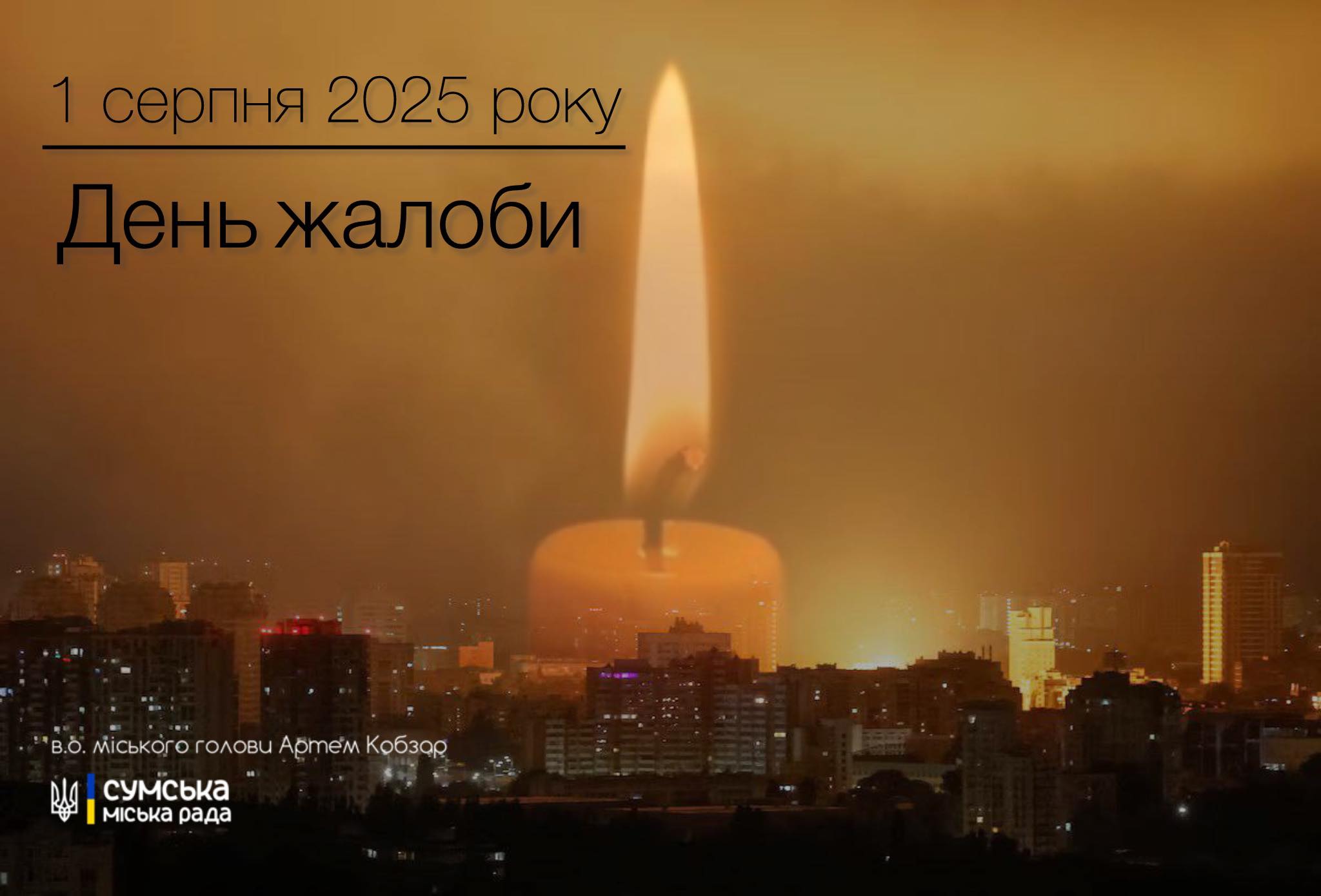 🕯️З глибоким сумом повідомляємо, що 1 серпня 2025 року оголошено Днем жалоби в Сумській міській територіальній громаді. Це рішення прийнято у зв’язку з жахливою трагедією, яка спіткала Україну в ніч з 30 на 31 липня. Внаслідок масованої ворожої атаки на Київ загинули мирні мешканці, чиї життя обірвалися надто рано.