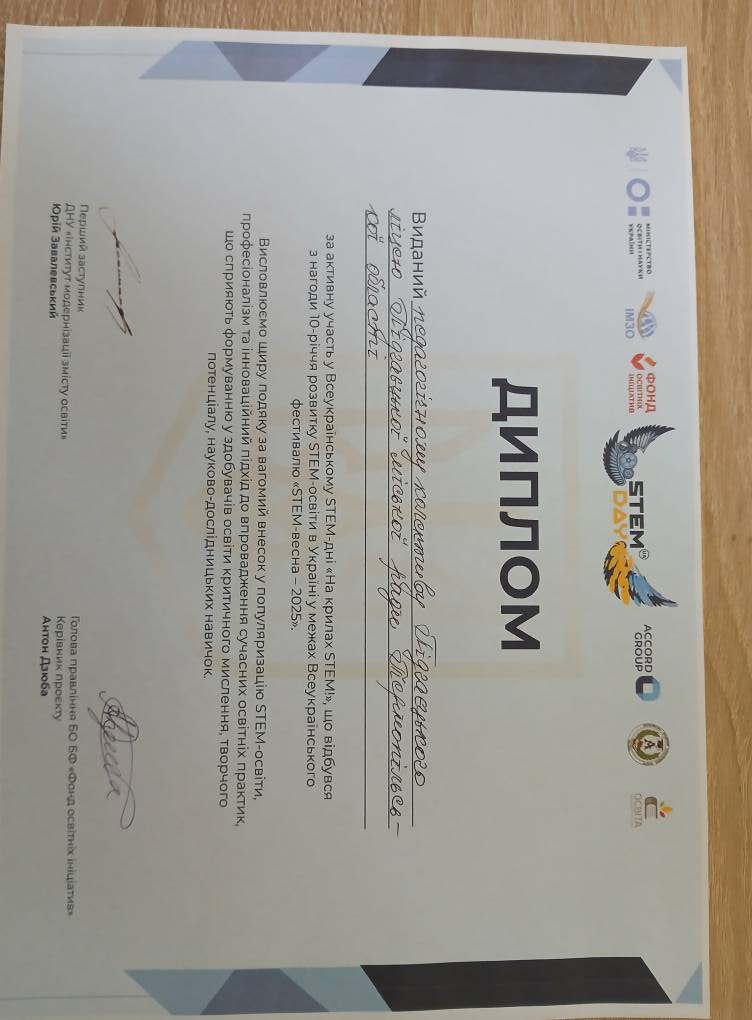 🏅 Педагогічний колектив Підгаєцького ліцею отримав заслужену нагороду – диплом, а окремі педагоги були відзначені сертифікатами 📜 за їхню активну участь, невичерпне натхнення та значний внесок у розвиток STEM-освіти в Україні.