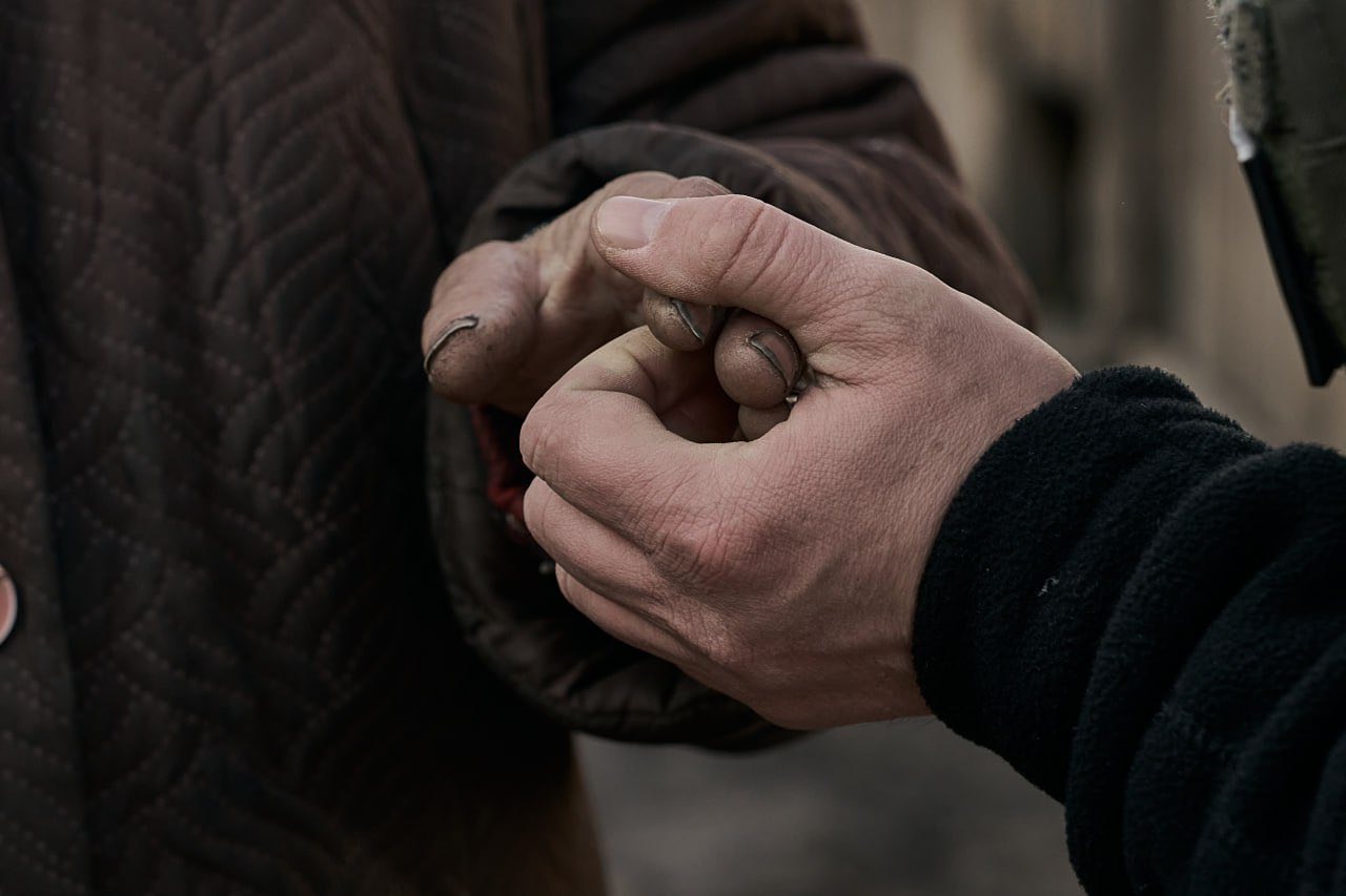 Капелан, який щодня ризикує власним життям, займаючись евакуацією цивільних із зони бойових дій, дбайливо тримає за руку жінку старшого віку, вмовляючи її поїхати з небезпечного Покровська. У цих кількох секундах – невидима, але така важлива турбота, що виражається через простий жест.