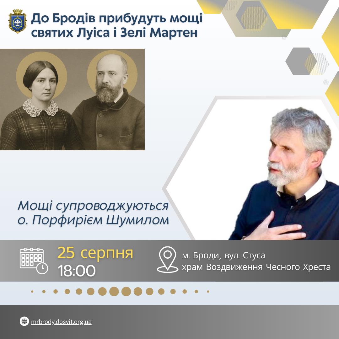 До Бродів прибувають мощі святих Луїса та Зелі Мартен, батьків святої Терези від Дитятка Ісуса. Ця визначна подія відбудеться 25 серпня 2025 року в Ювілейному храмі Воздвиження Чесного Хреста. Святе подружжя Мартен є першою канонізованою католицькою подружньою парою, що є яскравим прикладом християнського сімейного життя, любові та виховання дітей у вірі. Їхні мощі, що подорожують з Франції, відвідають Україну, надаючи вірянам унікальну можливість помолитися та отримати Божі ласки за їхнім заступництвом.