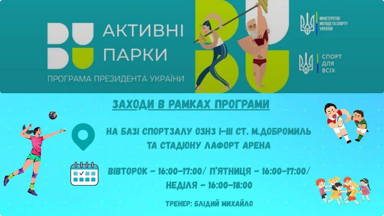 До Вашої уваги графік проведення спортивних заходів в рамках проєкту « Активні парки- локації здорової України» на цей тиждень у м. Добромиль