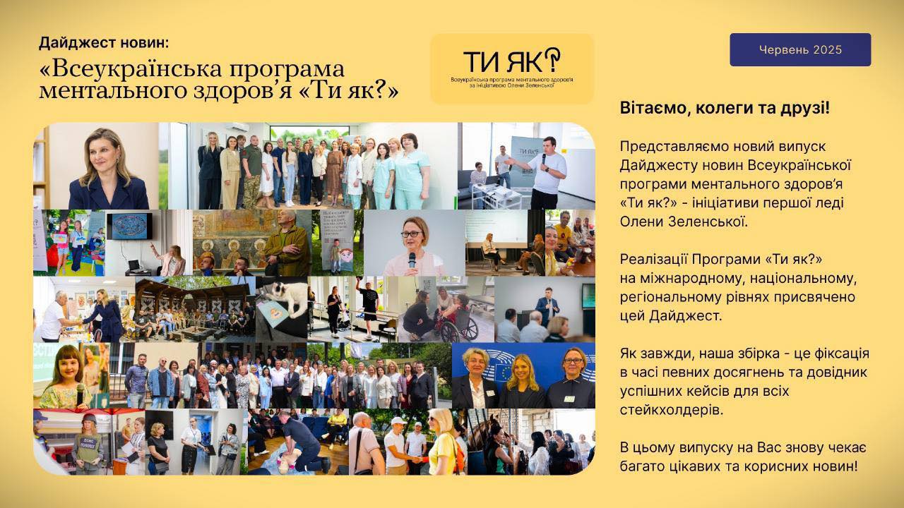 Ми раді представити вашій увазі черговий випуск Дайджесту новин Всеукраїнської програми ментального здоров’я «Ти як?», що охоплює події червня 2025 року. Цей важливий інформаційний ресурс створено для того, аби кожен міг залишатися в курсі ключових подій та ініціатив, спрямованих на покращення ментального здоров’я українців. Це не просто збірка новин, а й цінний часопис, що сприяє безперервному обміну досвідом серед фахівців та громадськості, які працюють над питаннями психологічної підтримки.У сучасному світі, де виклики повсякденності можуть мати значний вплив на наш внутрішній стан, турбота про ментальне здоров’я стає невід’ємною частиною загального добробуту. Всеукраїнська програма ментального здоров’я «Ти як?», ініційована Оленою Зеленською, є фундаментальним кроком до побудови стійкого та здорового суспільства. Дайджест слугує надійним довідником кейсів, успішних практик та важливих оновлень для всіх стейкхолдерів програми — від державних установ до громадських організацій та волонтерів. Він акумулює найважливіші матеріали, що стосуються реалізації програми, досягнень та майбутніх планів у сфері психічного здоров’я.Цей випуск дайджесту містить ексклюзивні матеріали, аналітичні огляди та історії успіху, які демонструють ефективність застосованих підходів у роботі з ментальним здоров’ям. Кожен розділ ретельно підібраний, щоб надати читачам максимально повну картину поточного стану справ у галузі та надихнути на подальші дії. Ми запрошуємо всіх зацікавлених осіб, фахівців, представників громадських організацій та громадян, які піклуються про свій добробут українців та здоров’я нації, до глибокого ознайомлення з цим інформаційним оглядом. Це чудова можливість отримати знання, обмінятися досвідом та долучитися до розвитку Всеукраїнської програми ментального здоров’я.Доступність інформації є ключовою для широкого охоплення аудиторії та ефективної реалізації ініціатив. Саме тому ми надаємо прямі посилання для легкого доступу до випуску. Щоб ознайомитися з дописом Координаційного центру з психічного здоров’я КМУ про новий випуск, перейдіть за посиланням: https://bit.ly/4nO0A36. А пряме посилання на сам Дайджест доступне тут: https://bit.ly/4605S55. Активна участь кожного — запорука успіху цієї надзвичайно важливої програми, яка покликана зміцнити стан психічного здоров’я нашої нації. Не пропустіть нагоду збагатити свої знання та стати частиною великого руху за покращення підтримки суспільства.