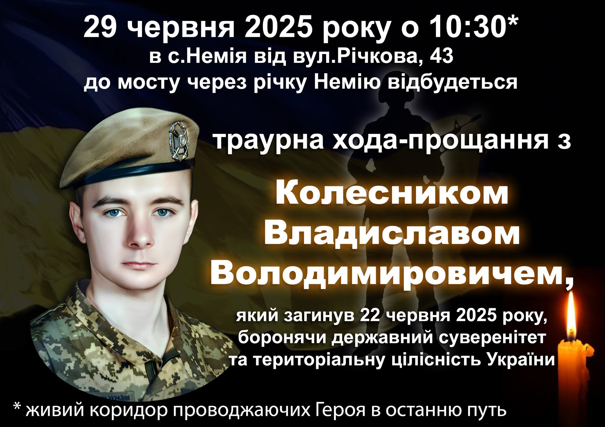 О 10:30 просимо утворити “живий коридор” в с.Немія від вул.Річкова, 43 до мосту через річку Немію та провести Героя в останню путь.