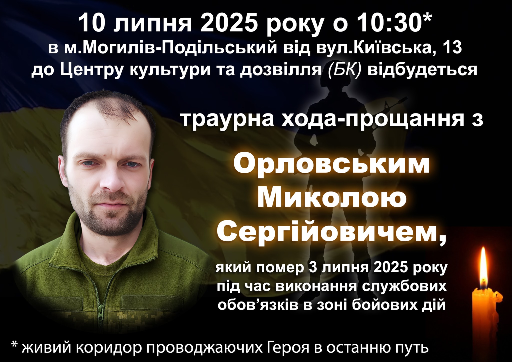 10 липня 2025 року наша громада прощатиметься з нашим Захисником – Орловським Миколою Сергійовичем, який помер 3 липня 2025 року під час виконання службових обов’язків в зоні бойових дій на Чернігівщині.