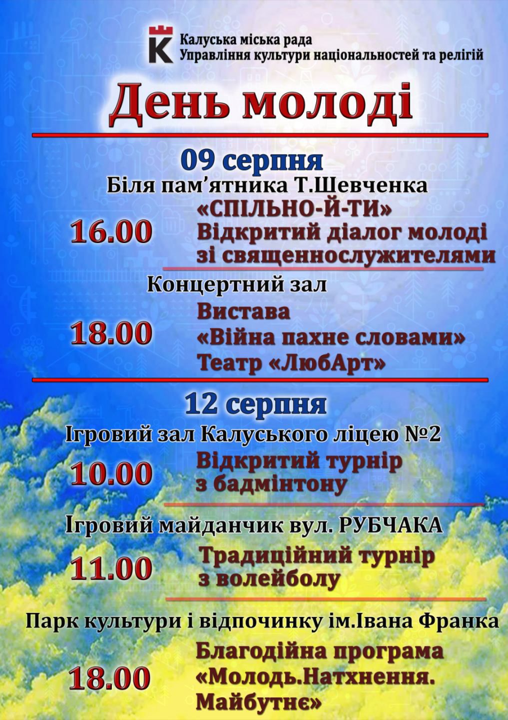 У рамках Дня молоді, який відзначають 12 серпня, у Калуській громаді заплановано низку заходів, спрямованих на підтримку молодіжних ініціатив, духовного розвитку, спорту, мистецтва та благодійності.