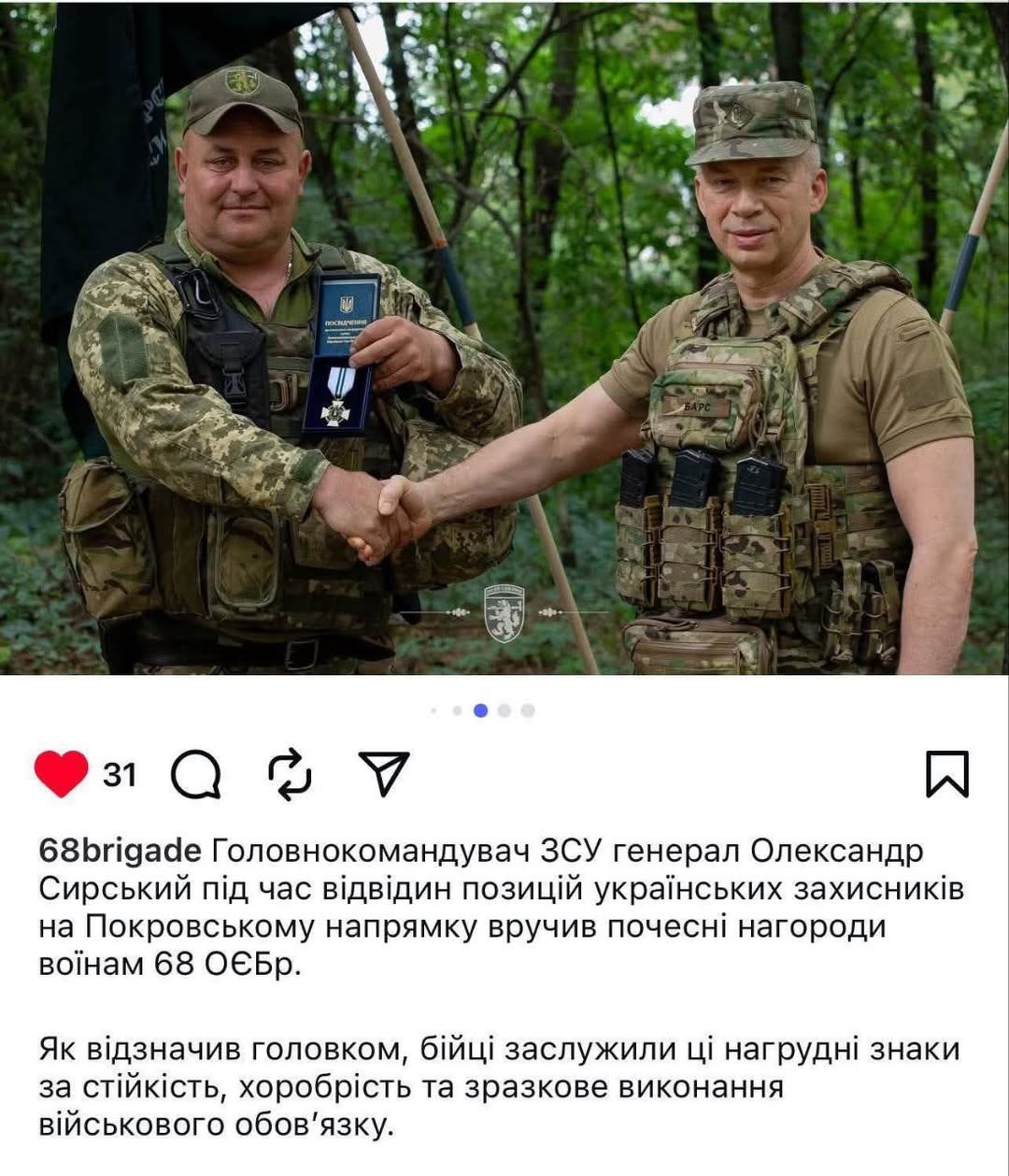 Сирський відзначив героїв 68-ї бригади на Покровському напрямку