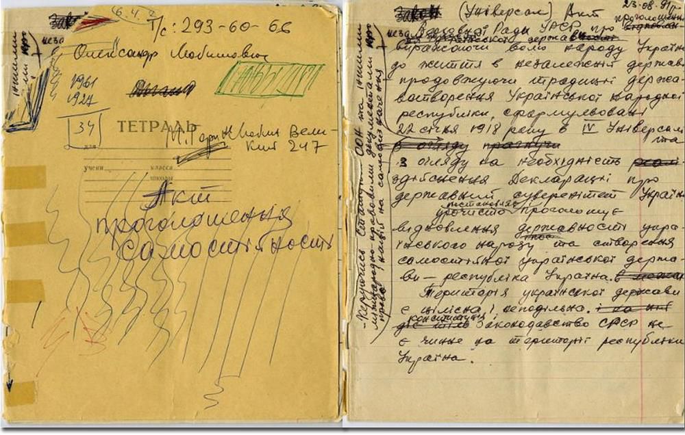 23 серпня 1991 року, вранці, була написана чернетка Акту проголошення Незалежності України. Цей історичний документ був створений Леонідом Сандуляком та Левком Лук’яненком у звичайному шкільному зошиті. Це свідчення того, як народжувалася наша незалежність, з простих, але вагомих кроків.