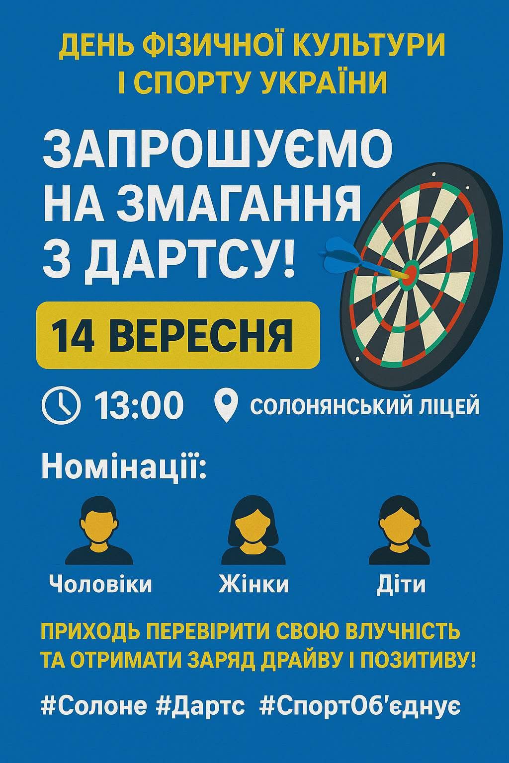 🎯 Змагання з дартсу: 14 вересня о 13:00. Місце проведення: територія Солонянського ліцею. Змагання пройдуть у трьох категоріях: чоловіки, жінки та діти. Покажіть свою влучність та майстерність!