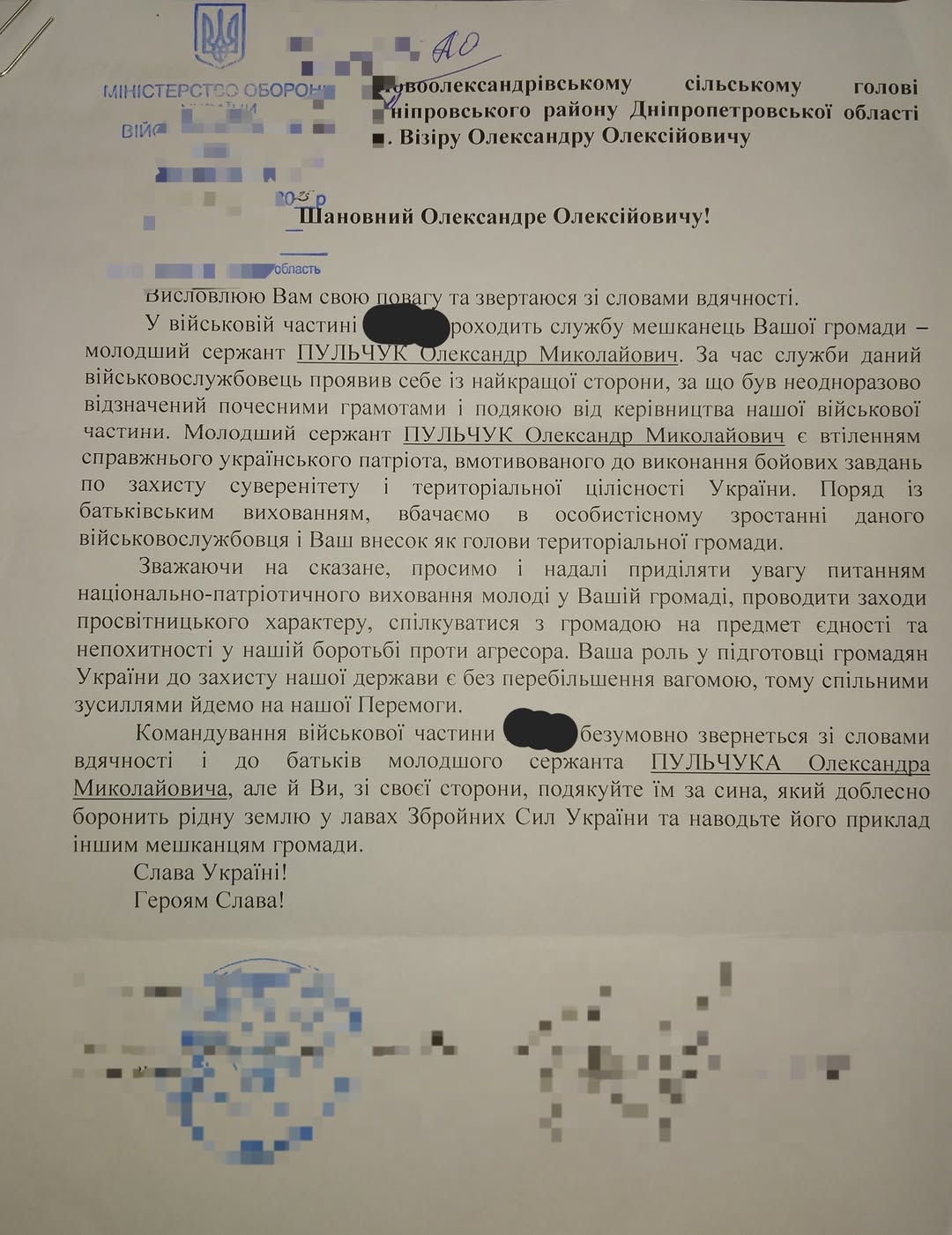 До Новоолександрівської сільської ради надійшов лист-подяка на адресу Пульчука Олександра Миколайовича, висловлюючи вдячність від військової частини, де наш Захисник несе службу. Олександр Миколайович є справжнім втіленням українського патріотизму, демонструючи неабияку вмотивованість у виконанні бойових завдань, спрямованих на захист суверенітету та територіальної цілісності України. Ми пишаємося такими відданими Захисниками, як Олександр Миколайович! Його мужність та самовідданість є прикладом для наслідування. Патріотизм Олександра Миколайовича надихає на підтримку наших військових. Він є гордістю Новоолександрівської громади. Підтримка таких героїв, як Олександр Миколайович – наш обов’язок.