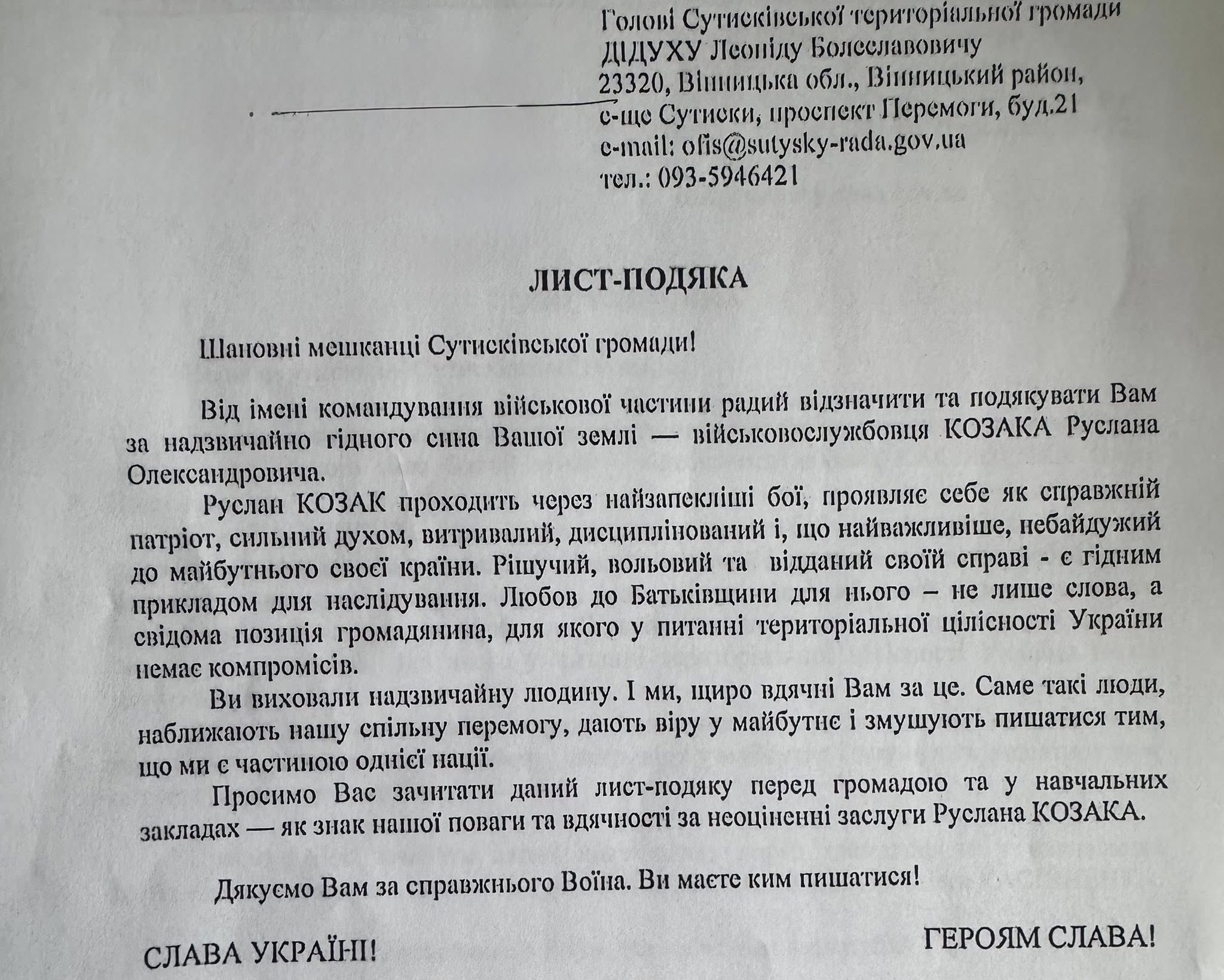 До Сутисківської селищної ради надійшов надзвичайно щирий і зворушливий лист-подяка від військової частини, який був адресований нашому шановному земляку, Герою України Руслану КОЗАКУ🇺🇦. У цьому посланні висловлені глибокі слова вдячності за його незламну вірність українському народові, бездоганне сумлінне виконання бойових завдань та віддану, сповнену доблесті службу з захисту нашої рідної землі. Ми безмежно пишаємось нашим відважним захисником — мужнім, сильним, незламним воїном. Водночас, ми висловлюємо не менш глибоку вдячність його родині, яка з гідністю, неймовірною витримкою та безмежною любов’ю тримає тил. Ваша підтримка є неоціненною. Ми висловлюємо глибоку повагу та безмежну вдячність кожному українському воїну, хто щодня стоїть на варті незалежності України, захищаючи наше майбутнє 🙌🇺🇦. Ваш подвиг назавжди закарбований у наших серцях. Слава Україні! Слава нашим Героям!