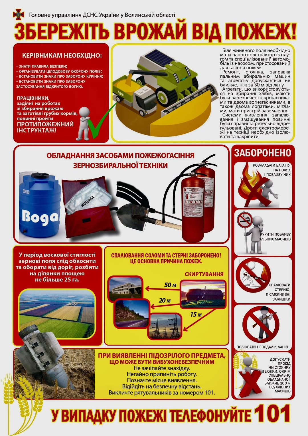 🔸 у період збирання врожаю біля жнивного поля необхідно мати напоготові трактор з плугом та спеціалізований автомобіль з насосом (цистерна з водою), пристосований для гасіння пожежі хліба на корні;