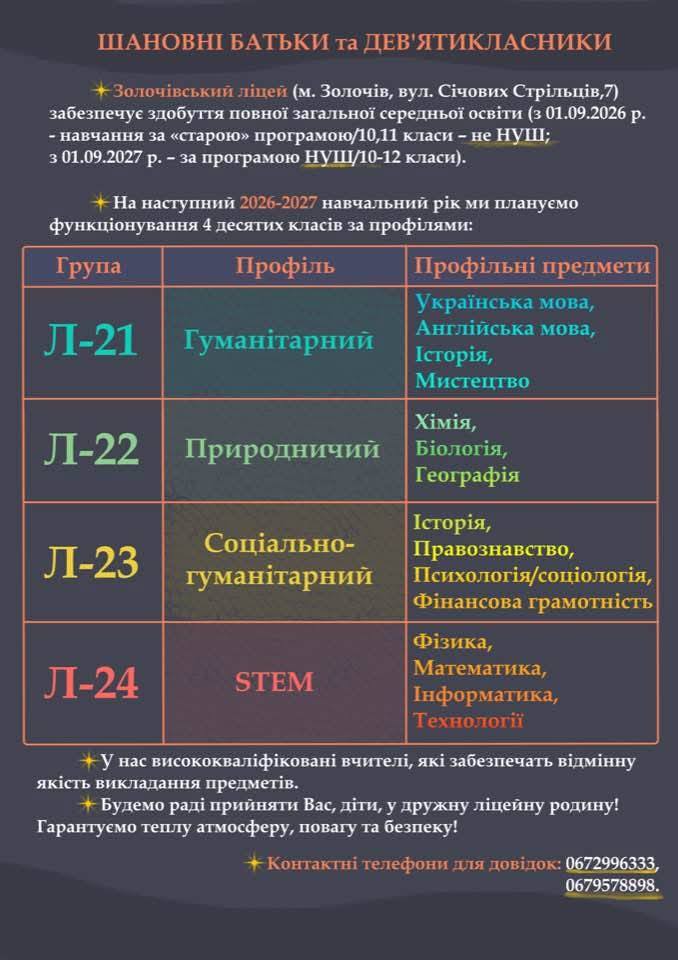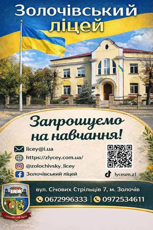 📢 Батьків та майбутніх дев’ятикласників Золочівщини запрошуємо до Золочівського ліцею! Ми раді оголосити про початок набору учнів до 10-х класів на 2026–2027 навчальний рік. Навчальний заклад розташований за адресою: м. Золочів, вул. Січових Стрільців, 7.