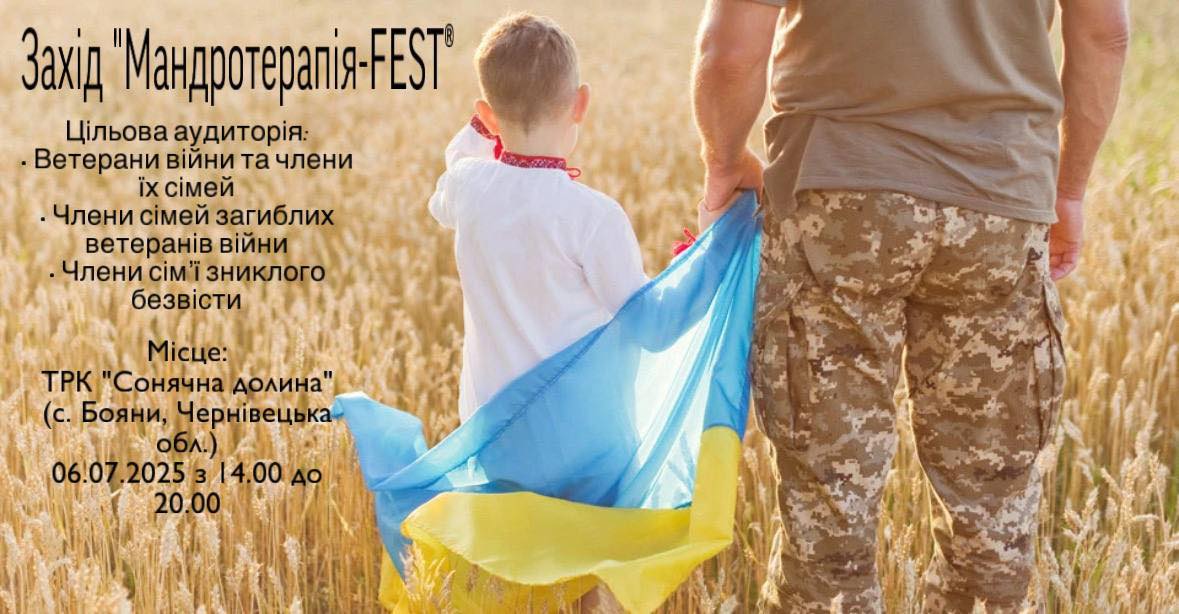 ❇️06 липня 2025 року з 14 год 00 хв на території туристично-розважального комплексу “Сонячна долина” (село Бояни Чернівецького району Чернівецької області) відбудеться захід «Мандротерапія-FEST», приурочений річниці проєкту «Мандротерапія». Заходом передбачено: концертна програма, розваги для дітей, майстер-класи, фудкорти, спортивні змагання.