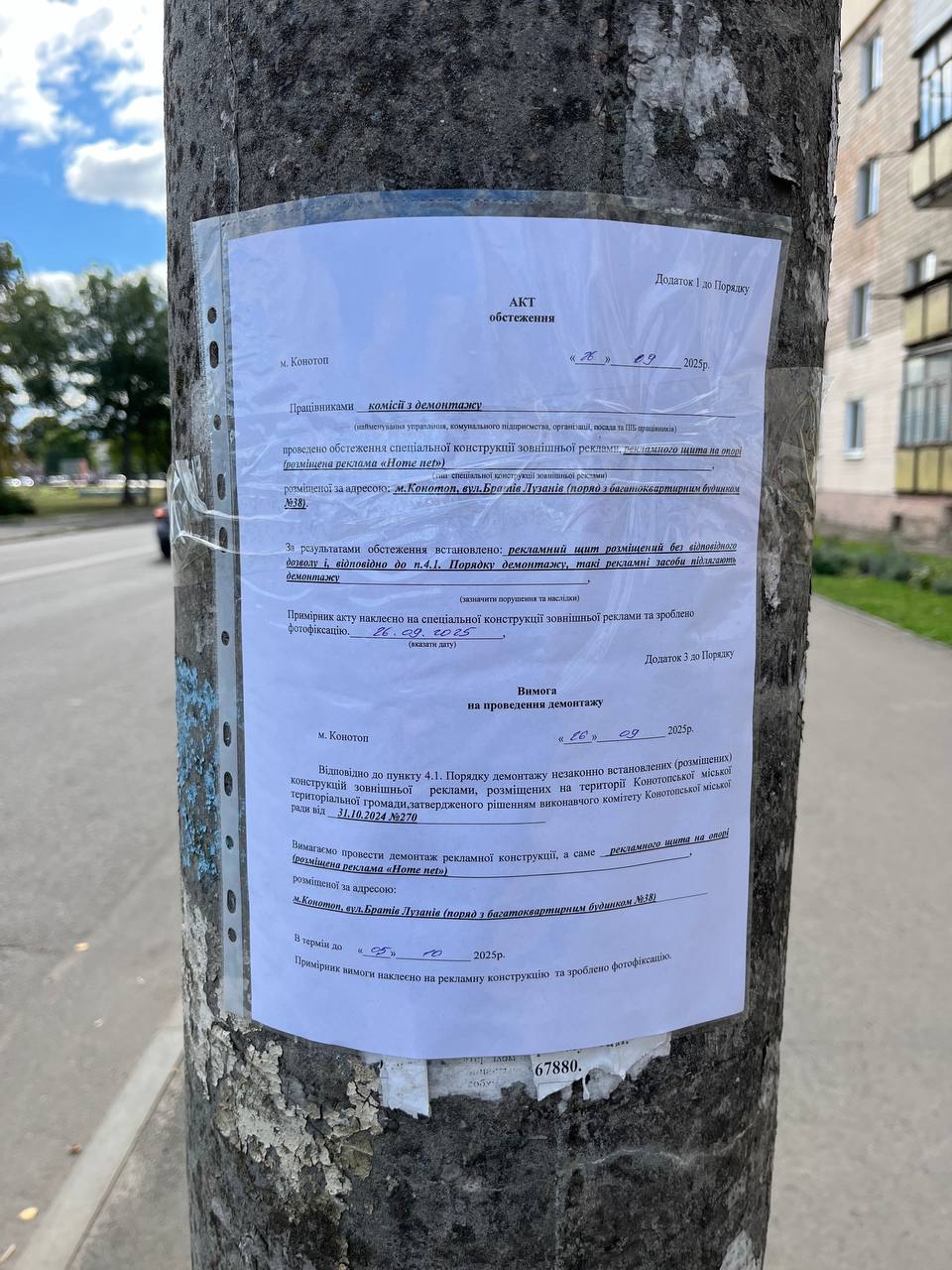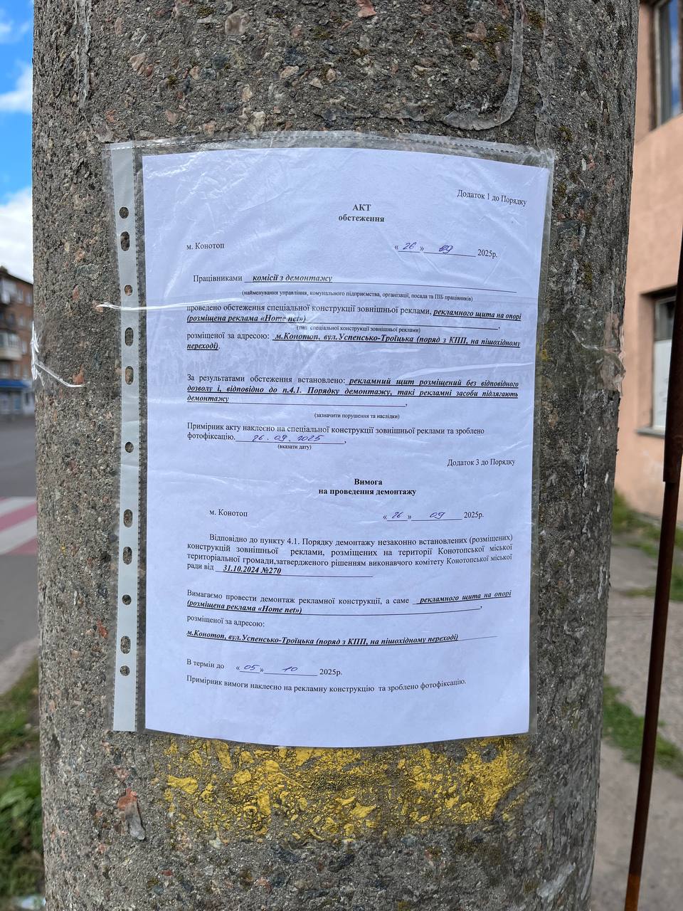 Власники та користувачі спеціальних конструкцій зовнішньої реклами, зверніть увагу! Вам необхідно провести демонтаж ваших рекламних засобів до 5 жовтня 2025 року. Це вимога пункту 4.1.1 «Порядку демонтажу незаконно встановлених (розміщених) конструкцій зовнішньої реклами, розміщених на території Конотопської міської територіальної громади», який був затверджений рішенням виконавчого комітету від 31 жовтня 2024 року за №270. Основною причиною для демонтажу є відсутність належного дозволу на розміщення рекламних засобів.