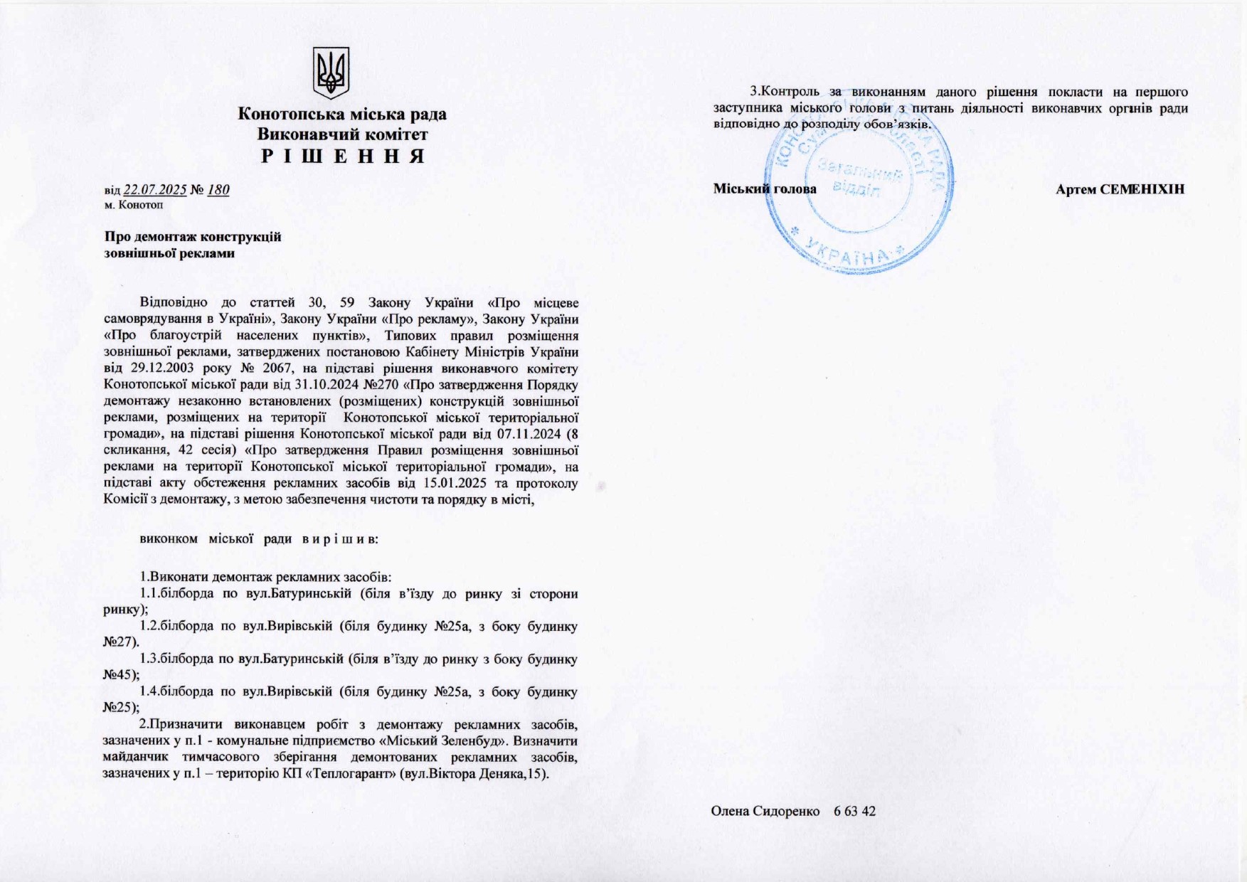 Власники рекламних засобів, увага! Зверніть увагу, що з 28 липня розпочнеться демонтаж рекламних конструкцій, які були зазначені у рішенні виконавчого комітету від 22.07.2025 №180 “Про демонтаж конструкцій зовнішньої реклами”. Ця дія стосується певних рекламних засобів, які не відповідають встановленим нормам або були розміщені з порушеннями. Метою цього рішення є впорядкування зовнішнього вигляду міста та забезпечення дотримання правил благоустрою. Власникам зазначених рекламних засобів наполегливо рекомендується ознайомитися з повним текстом рішення виконкому для уточнення деталей щодо їхніх конструкцій. Демонтаж проводитиметься згідно з встановленим графіком. Важливо завчасно підготуватися до цієї події, щоб уникнути можливих непорозумінь чи додаткових витрат. Зверніть увагу, що рішення виконкому є обов’язковим до виконання. Для отримання детальнішої інформації щодо списку рекламних засобів, які підлягають демонтажу, та термінів проведення робіт, будь ласка, зверніться до офіційних джерел міської ради або ознайомтеся з відповідною постановою.