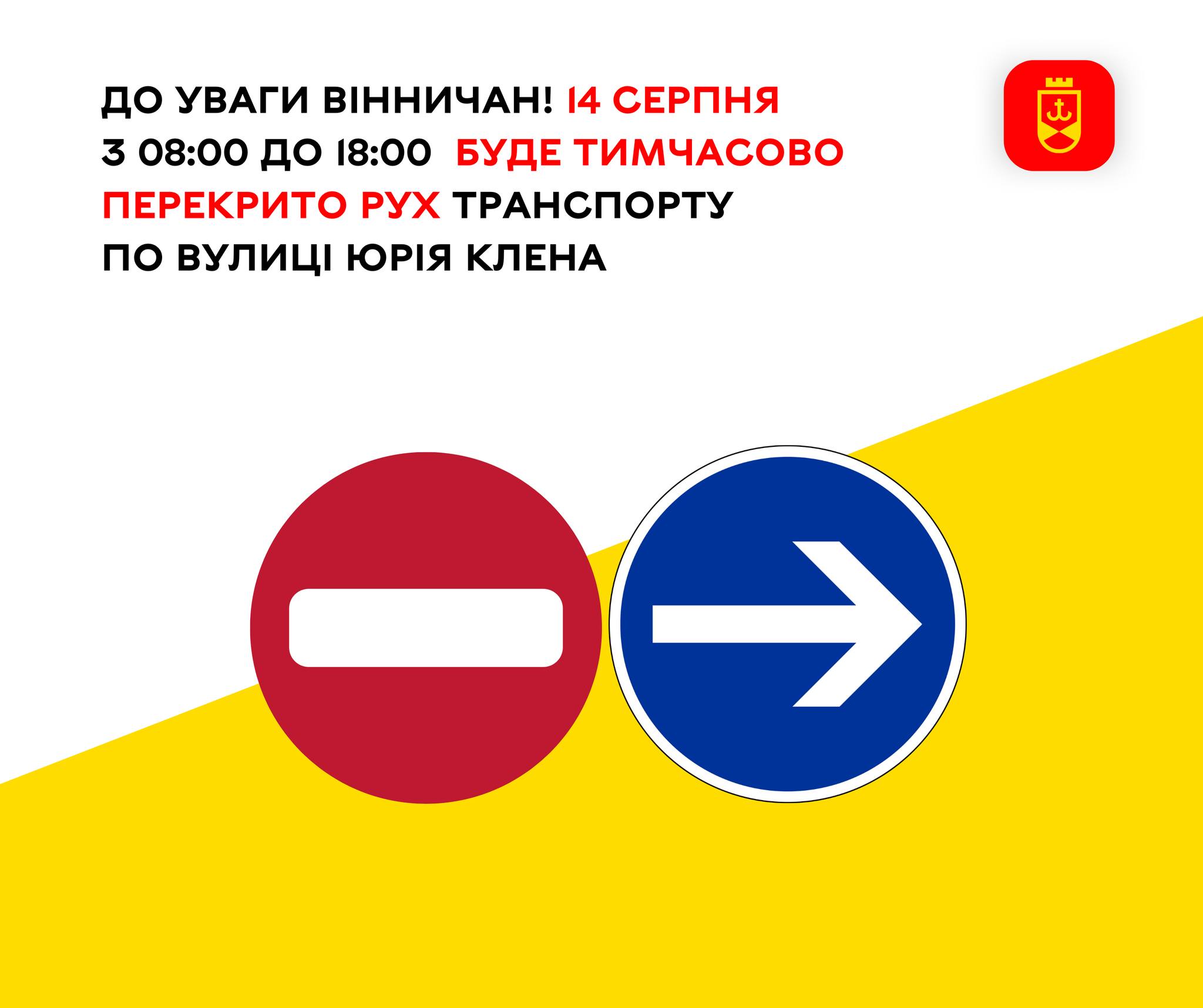 До уваги вінничан! 14 серпня з 08:00 до 18:00 буде тимчасово перекрито рух транспорту по вулиці Юрія Клена.