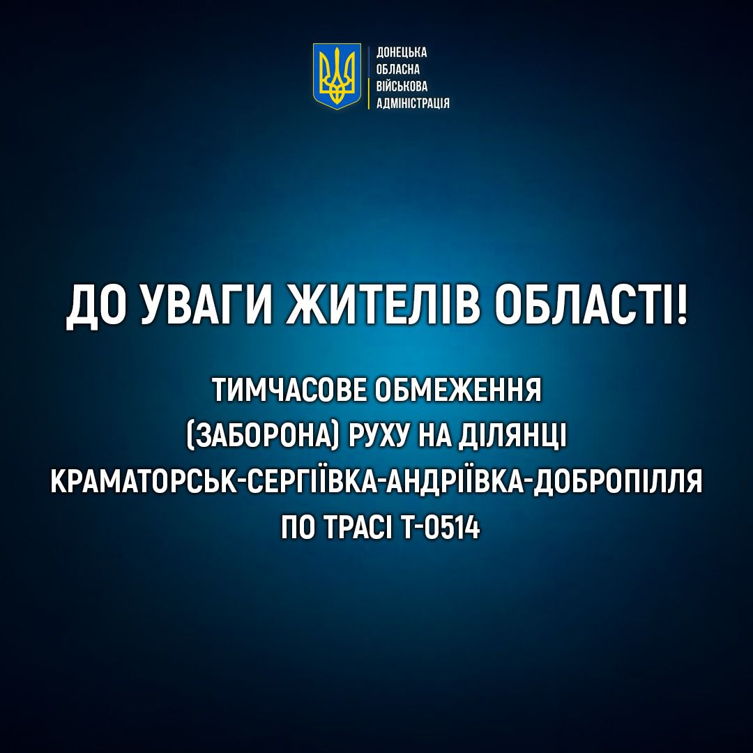 З 16 липня 2025 року вводиться тимчасове обмеження (заборона) для громадян, іноземців та осіб без громадянства, а також руху цивільних транспортних засобів на ділянці Краматорськ – Сергіївка – Андріївка – Добропілля автомобільної дороги загального користування державного значення Т-05-14 Добропілля – Лиман км 5+850 – км 49+615.