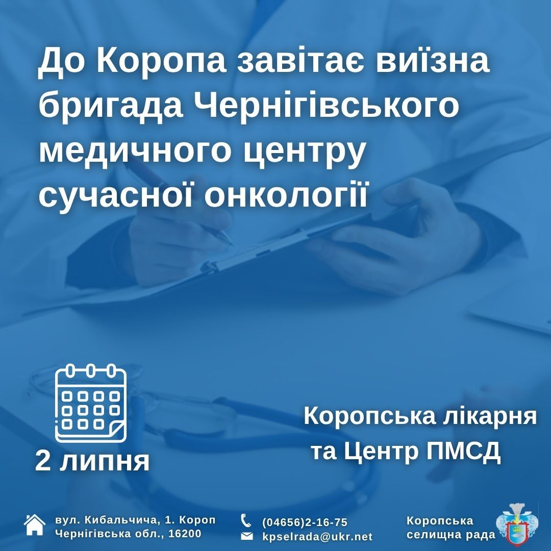 Нагадаємо, що 2 липня 2025 року до Коропської центральної лікарні та Коропського центру первинної медико-санітарної допомоги завітає виїзна бригада лікарів з Чернігівського медичного центру сучасної онкології 🏥
