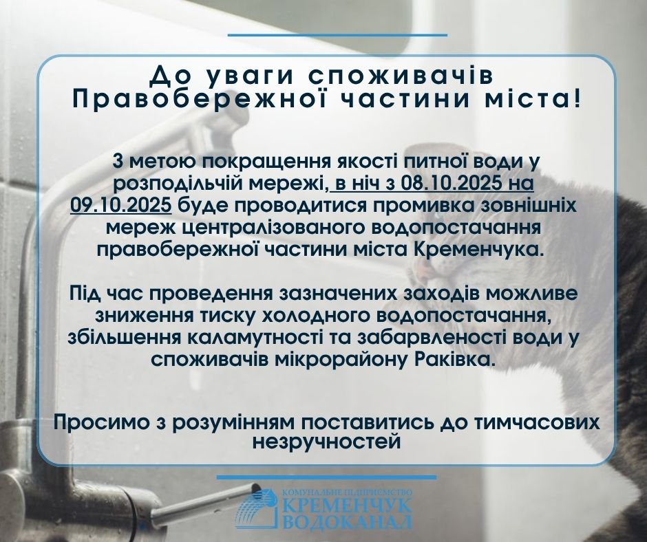 🚰 Шановні мешканці правобережної частини міста! Повідомляємо, що з метою покращення якості питної води, КП «Кременчукводоканал» планує проведення важливих робіт. В ніч з 8 на 9 жовтня будуть здійснюватися роботи з промивки зовнішніх мереж централізованого водопостачання. Це планова процедура, спрямована на забезпечення мешканців чистою та безпечною питною водою.