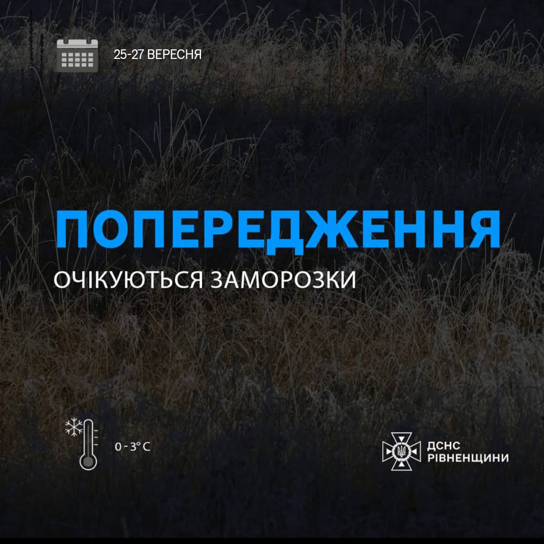 Увага, мешканці Рівненщини! Рівненський обласний центр з гідрометеорології попереджає про надходження небезпечного погодного явища. Вночі та вранці, протягом 25-27 вересня, на території Рівненської області очікуються сильні заморозки. Температура повітря може опуститися до 0..-3ºС. Це явище має ІІ рівень небезпечності, що позначається помаранчевим кольором 🟠.