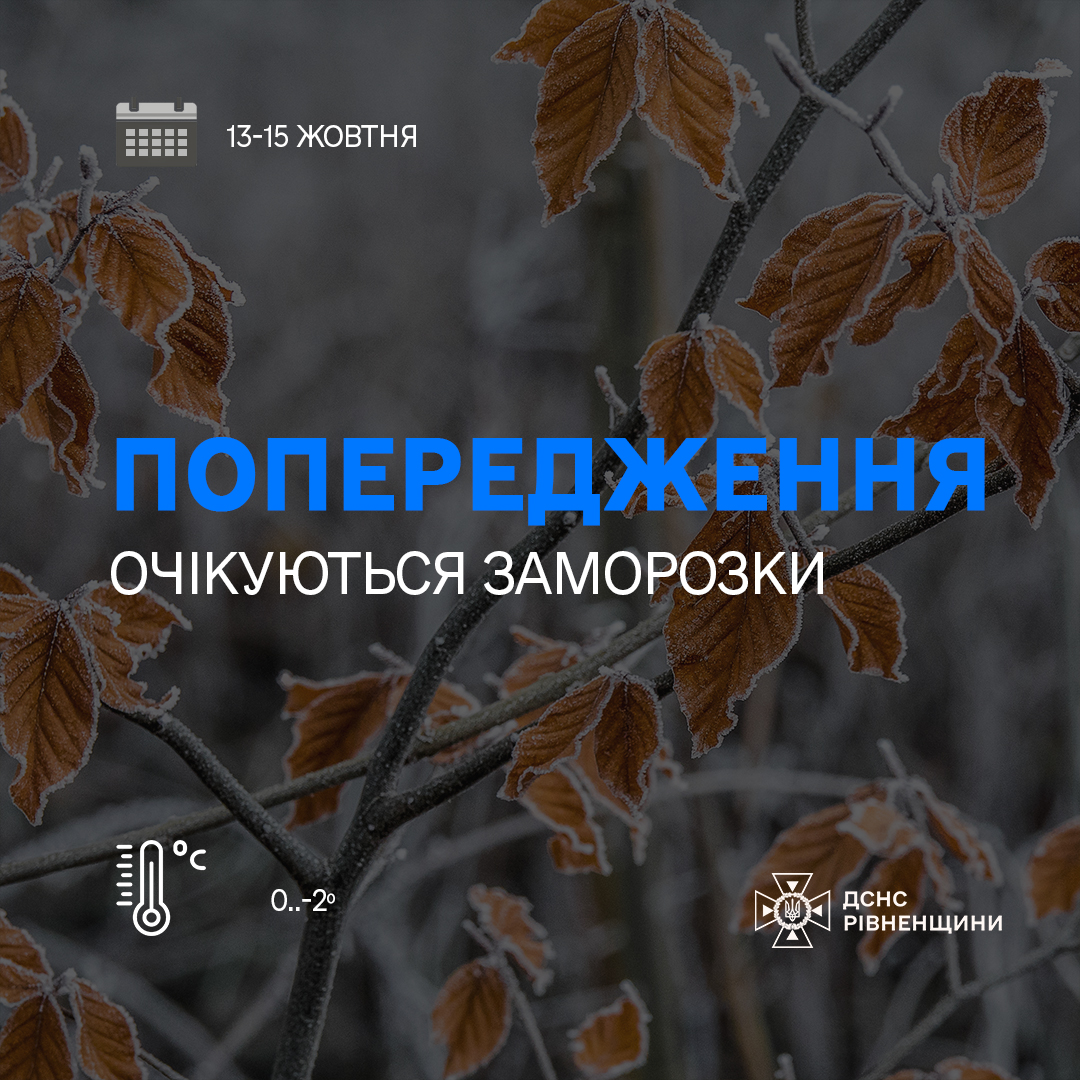 За прогнозами обласного гідрометеоцентру, вночі та вранці в період з 13 по 15 жовтня на Рівненщині очікуються заморозки в повітрі. Температура повітря може опускатися до 0…-2ºС. Це свідчить про ІІ рівень небезпечності (помаранчевий) 🟠, що вимагає особливої уваги та обережності.