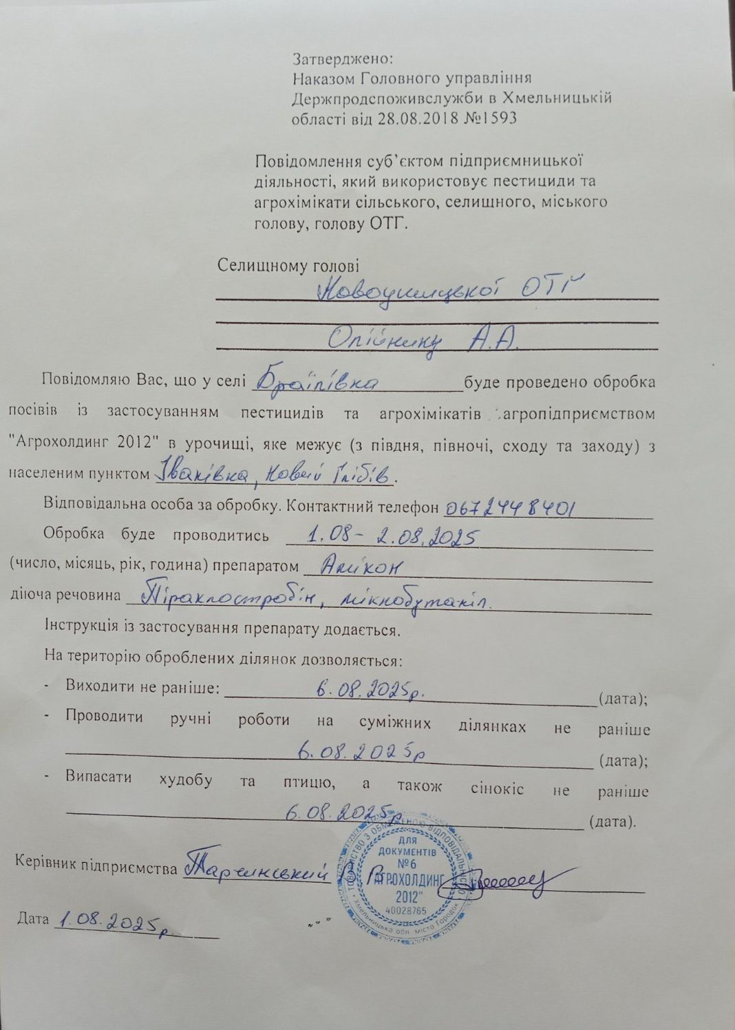 ❗️Шановні мешканці сіл Браїлівка, Іванівка та Новий Глібів! Повідомляємо вас про заплановані агрохімічні роботи. ТОВ «Агрохолдинг 2012» з 1 по 2 серпня 2025 року буде проводити обробку посівів пестицидами та агрохімікатами в урочищі села Браїлівка, що межує з населеними пунктами Іванівка та Новий Глібів.