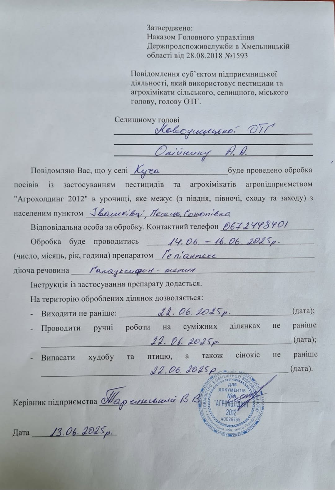 Агропідприємство ТОВ «Агрохолдинг 2012» повідомляє про проведення обробки посівів із застосуванням пестицидів та агрохімікатів у період з 14.06.2025 по 16.06.2025. Обробка відбуватиметься в с. Куча, в урочищі, яке межує з селами Івашківці, Песець та Соколівка.