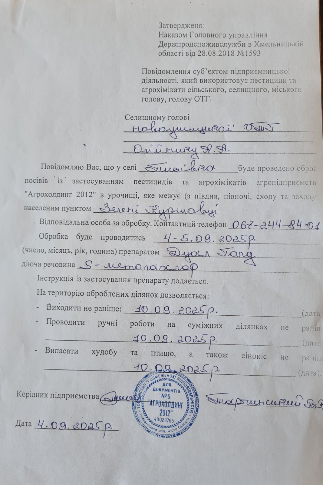 Повідомляємо вас про важливу подію, що стосується безпеки та сільського господарства у вашому регіоні. Агропідприємство ТОВ «Агрохолдинг 2012» планує проведення планової обробки посівів із застосуванням пестицидів та агрохімікатів. Ці роботи будуть проводитись у селі Пижівка, зокрема в урочищі, яке безпосередньо межує із селом Зелені Курилівці.