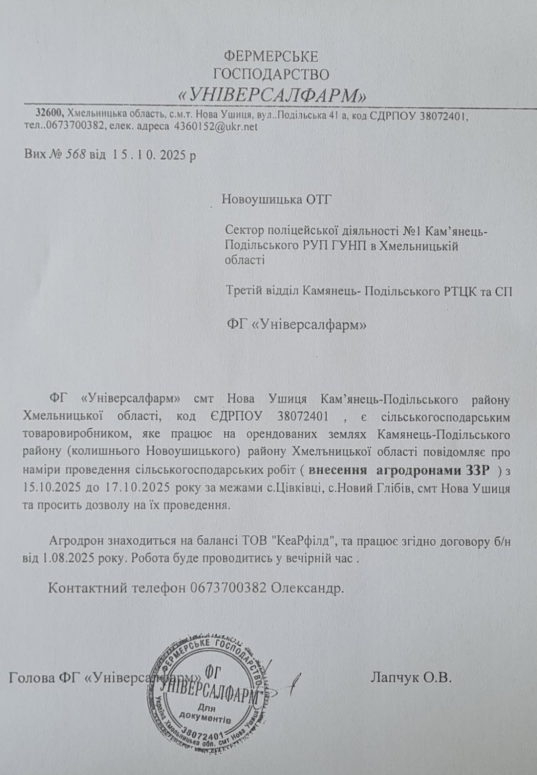 Повідомляємо вас про проведення планових сільськогосподарських робіт, які будуть здійснюватися фермерським господарством «Універсалфарм». Ці роботи включатимуть внесення засобів захисту рослин (ЗЗР) за допомогою агродронів.